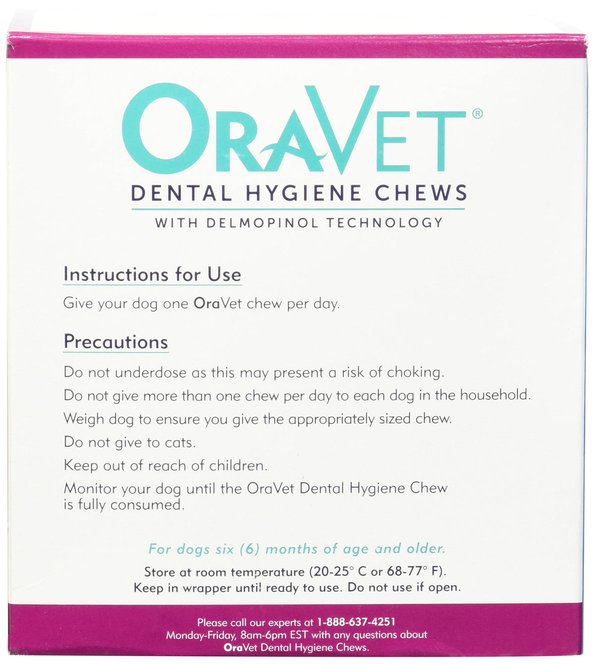 OraVet Dental Hygiene Chews combat bacterial attachment, the starting point of plaque, calculus and halitosis. Each chew releases delmopinol HIC, an ingredient that coats the teeth, tongue and gingiva to create a protective barrier against the bacteria that cause bad breath and are the basis for plaque. OraVet Dental Hygiene Chews also break down existing plaque and then effectively remove plaque and calculus through mechanical action. OraVet Dental Hygiene Chew should be given as directed by your veterinarian as part of your dog's complete preventive oral health care regimen. Always monitor your dog until the chew is fully consumed. Chews are intended for dogs six months of age and older. OraVet contains ingredients that include Chloraphyl, parsley flakes and alfalfa that may cause changes to you dogs stools.