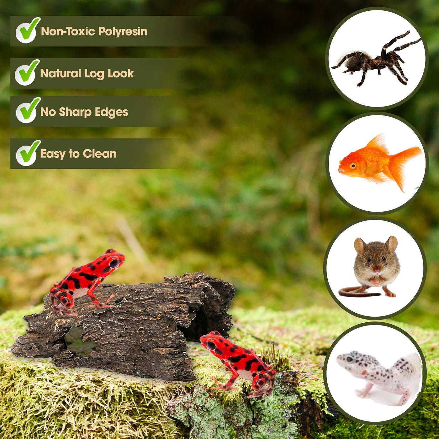 Q: Is the material of the log safe for my pets?A: Yes, the log is made from polyresin, which is a safe material for both reptiles and fish. It features smooth interiors with no sharp edges, ensuring the safety of your pets while they explore.