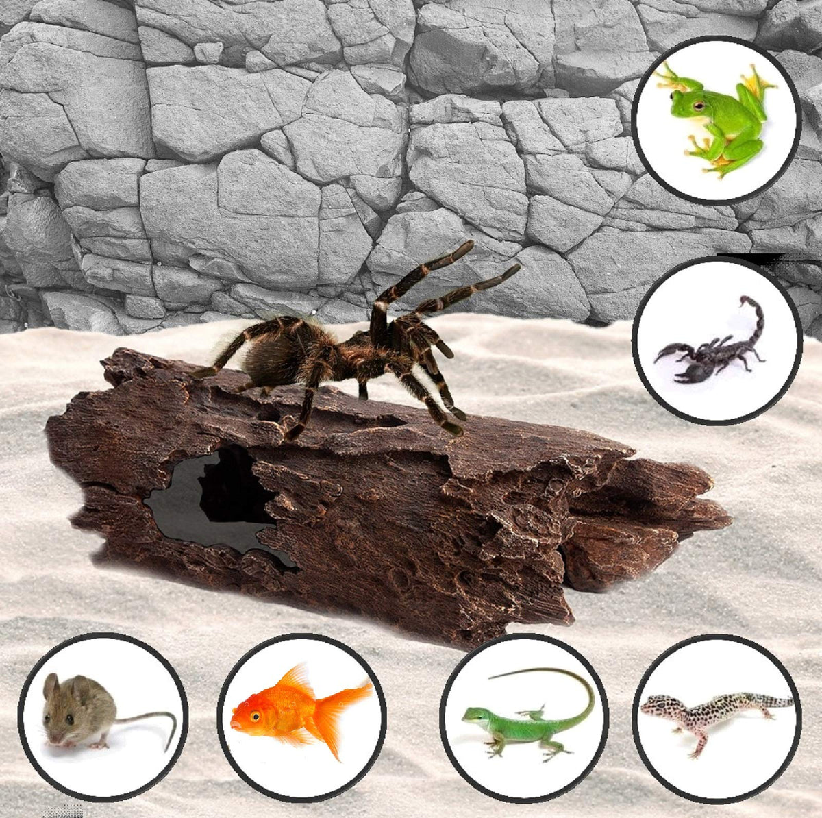 Q: How does this log help reduce stress for my pets?A: The natural design of the log creates a hiding space that mimics their natural habitat, promoting a sense of security. This can help reduce stress and boredom in both reptiles and fish.