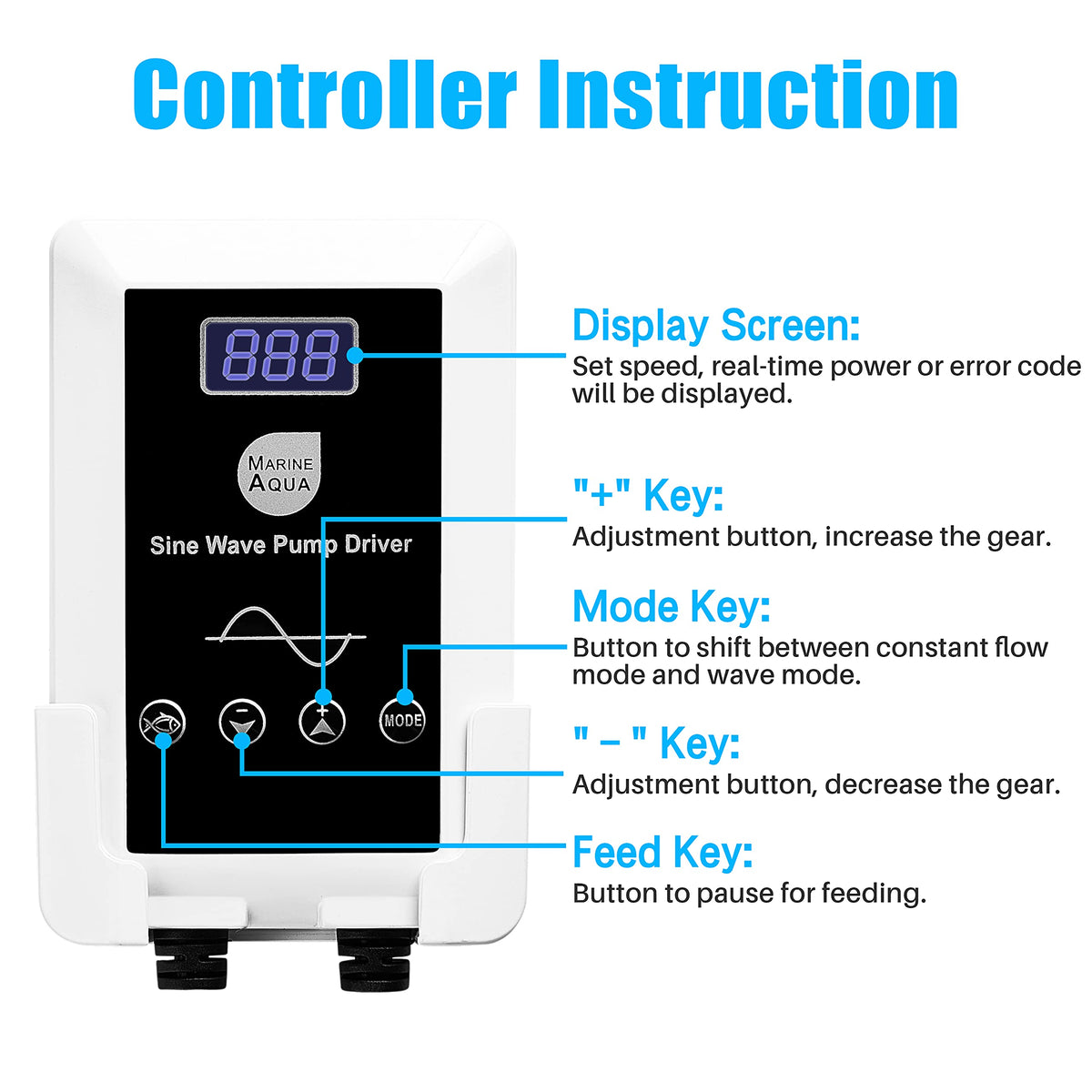 ★Sine wave technology , Ultra silent operation. Max. Flow Rate: 12000L/3100GPH Max. Head pressure: 16.5 ft. | ★Variable speed control with up to 20 different speed settings,offering precise adjustment of water flow for optimum performance. | ★Dc return pump modes:steady flow mode ,wave function/wave mode ,feed mode. | ★NO Copper components parts, Suitable for marine and fresh water,safe for any tank! | ★Low voltage, safe,IC Electronic Detection, Motor protection if rotor is blocked. With wear-resistant ceramic shaft, longer operation life.
