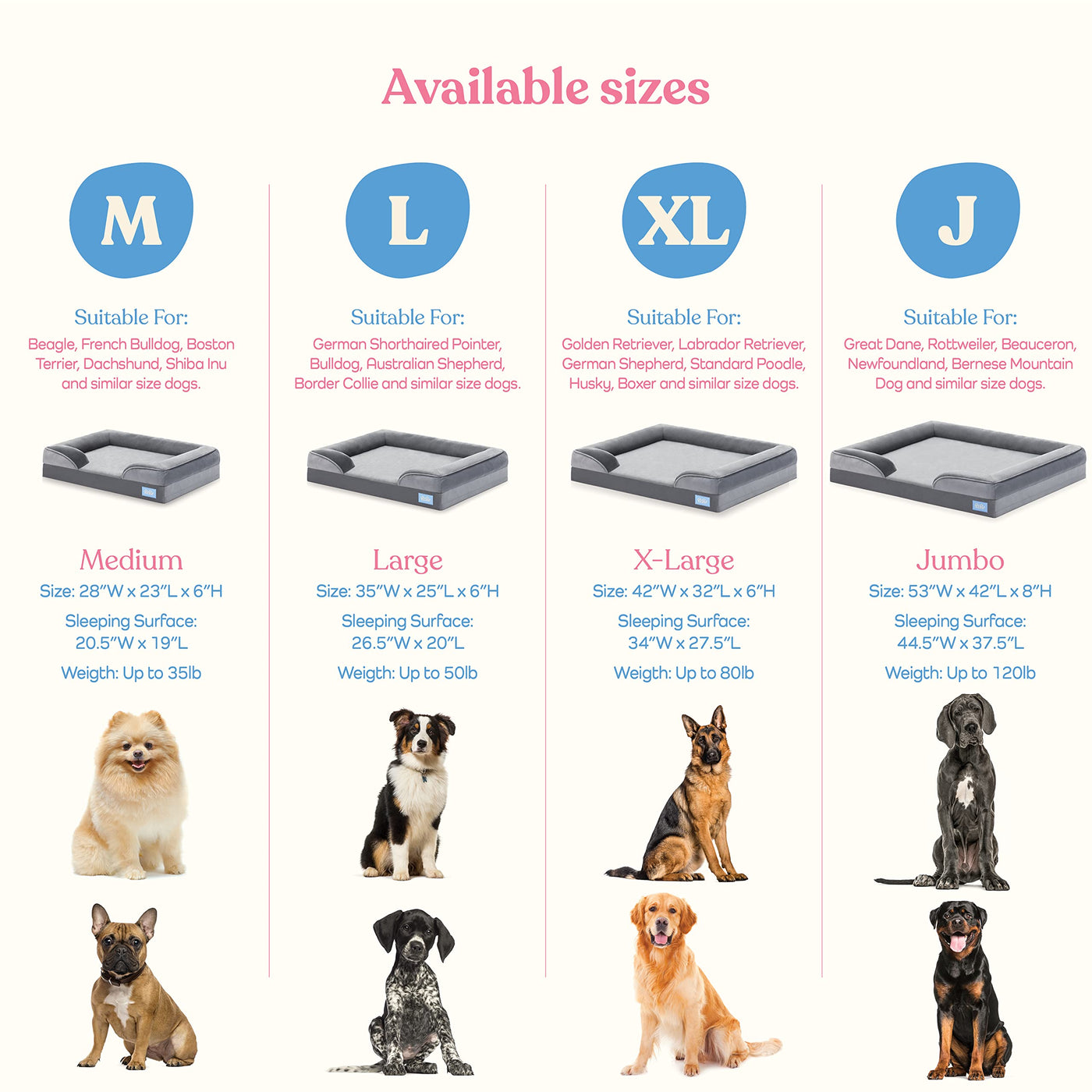 Q: What size should I choose for my large dog?A: The Orthopedic Sofa Dog Bed is available in XX-Large, with dimensions of 53.0 inches in length and 42.01 inches in width, making it ideal for large dogs who like to stretch out comfortably.