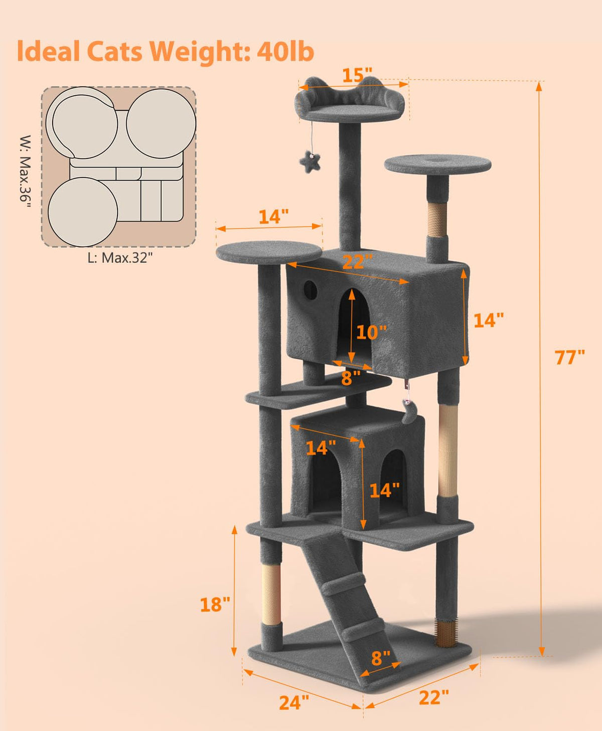 77-Inch Tall: For Cats Who Love To Climb To High Spaces And Observe The House. Safety First: Quality Materials, A Reinforced Base, And An Anti-Tip Kit Ensure A Stable And Safe Place For Your Cats To Jump Up And Down. All-Around Comfort: The Entire Cat Climbing Tree Is Covered With Soft Plush For Soothing Coziness. All-Around Fun: With 2 Pompoms, 2 Caves, 3 Perches,Your Cats Will Never Get Bored On This Cat Play Tower. Protects Your Furniture: 3 Scratching Posts Entertain The Restless Claws To Prevent Them From Ruining Your Furniture. Friendly To Kittens And Elderly Cats: The Multi-Level Design Makes It Easier To Climb Up And Down.