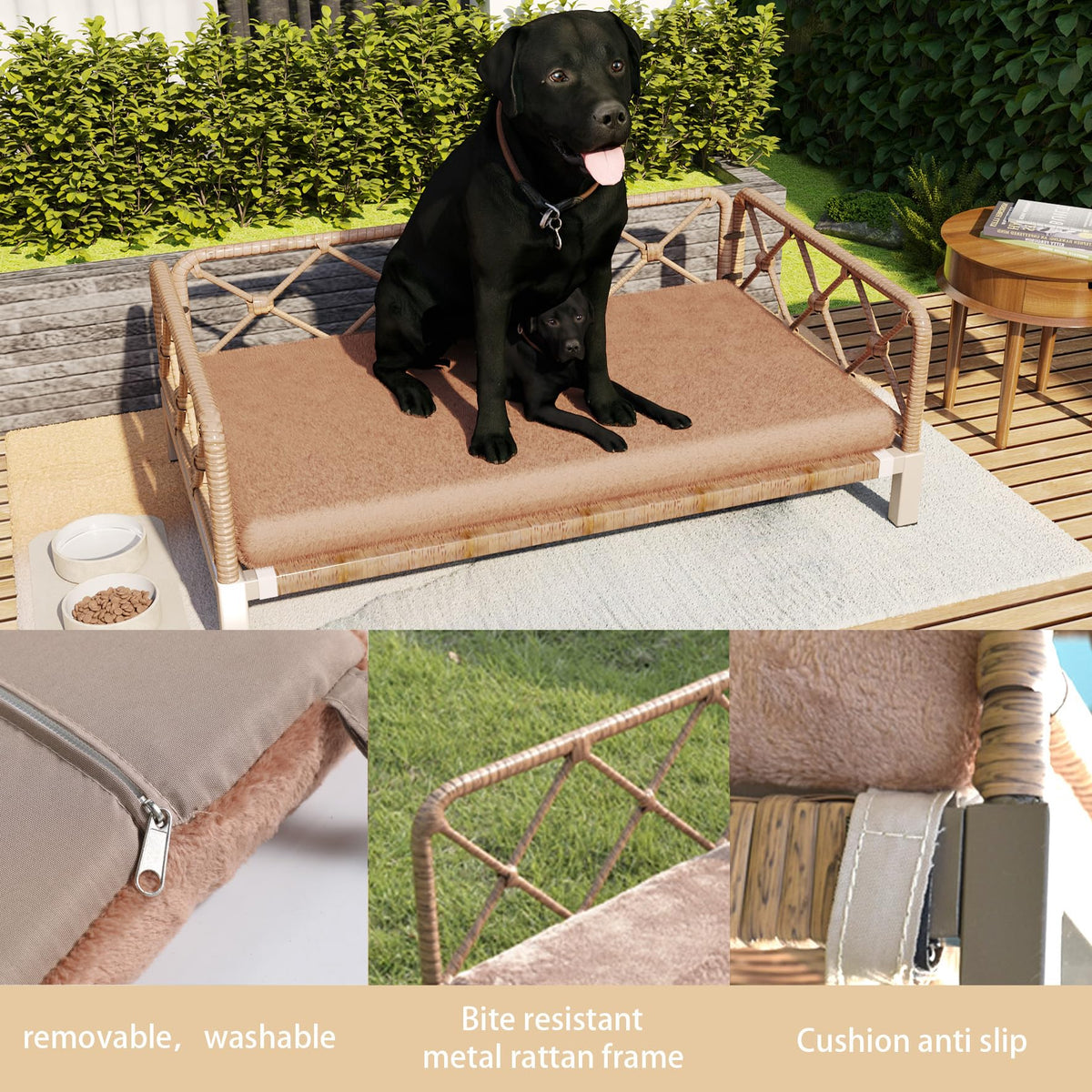 **Product Description: Wicker Rattan Outdoor Dog Bed** Elevate Your Pet'S Lounging Experience With Our Premium Wicker Rattan Outdoor Dog Bed. Crafted With A Robust Powder-Coated Steel Frame And Adorned With Exquisite Rattan Wicker, This Dog Bed Seamlessly Merges Style With Functionality. Measuring 25 Inches In Length, 19 Inches In Width, And 11 Inches In Height, The Bed Provides Ample Space For Your Furry Friend To Relax. The 4-Inch Elevation Off The Ground Ensures Proper Airflow And Comfort, While The Plush 2-Inch Thick Cushion Offers A Cozy Retreat. The Cushion Is Not Only Removable But Also Washable, Making It Easy To Maintain A Clean And Hygienic Environment For Your Pet. Designed For Year-Round Use, This Versatile Dog Bed Is Perfect For Both Indoor And Outdoor Settings. Whether Your Dog Enjoys Soaking Up The Sun On Your Patio Or Lounging In The Living Room, Our Wicker Rattan Dog Bed Accommodates All Preferences. Give Your Beloved Pet The Comfort They Deserve With This Elegant And Practical Solution. Suitable For Dogs And Cats Alike, This Cushion Bed Is An Ideal Choice For Pet Owners Who Appreciate Quality And Style. Invest In Your Pet'S Comfort Today!