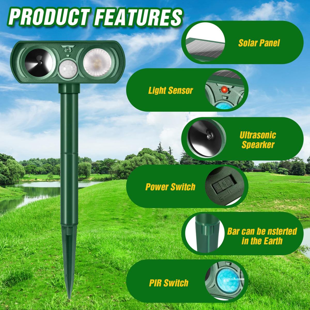 ?????????? ????????????:Solar ultrasonic cat deterrent mainly uses the principle of ultrasonic waves to act on a-n-i-m-a-l-s so that they will not i-n-t-e-r-f-e-r-e with your yard at will and is safe for humans and a-n-i-m-a-l-s.