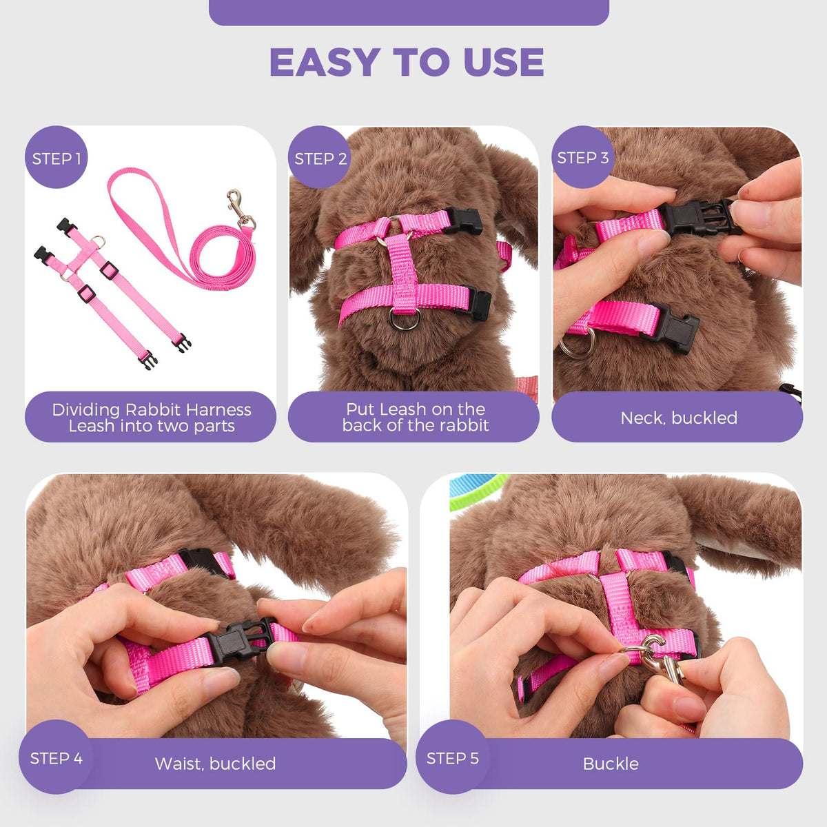 Features:Necessary tool:The pet harness leash is suitable for rabbits, kittens, puppies, ferrets and other small pets, it is a must for your pet to walk safely.Practical and easy to use: Always walking your pet also make the pets movements more agile and lively, also avoid fat, bunny leash and harness, these small pet harness leash straps have snaps at the end, after press and buckle can be worn and the operation is quick and easy.Specification: Material: nylonSize: Adjustable neck circumference: 7.09 - 10.24 inches/ 18 - 26 cmAdjustable bust: 7.87 - 11.81 inches/ 20 - 30 cmColor: as pictures showPackage includes:5 x Rabbit harness leashNote:These small pet harness leash will have a bit of thread but will not affect the use, you can cut it off with scissors when you receive it.Winding risk may exist, please use with care.Please check the size of your pet before buying to avoid size errors.