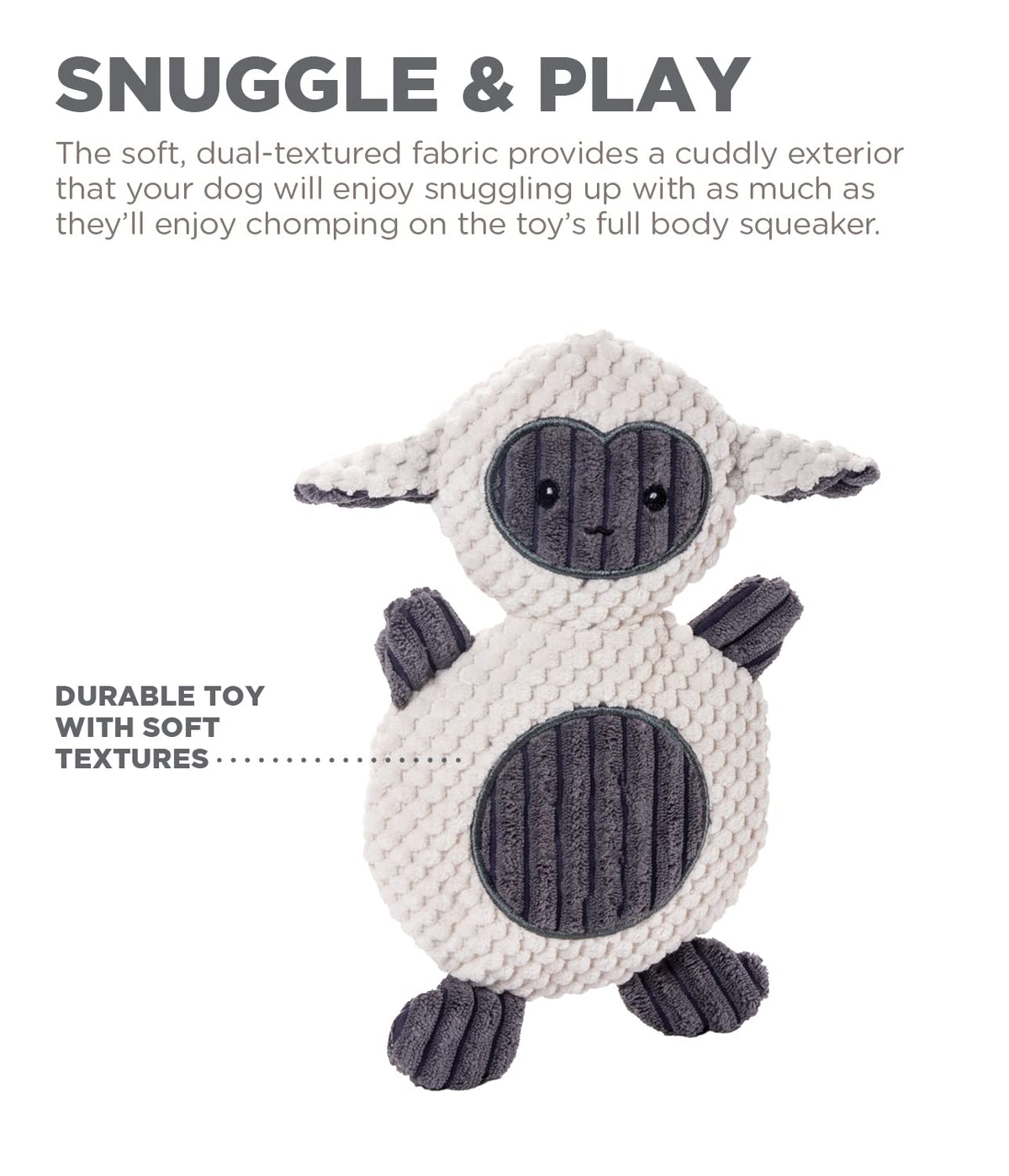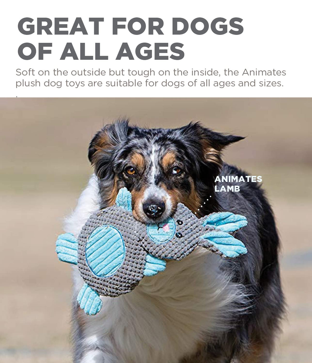 Q: What materials are used in the Animates Lamb Plush Dog Toy?A: This dog toy is made from polyester fabric and features K9 Tuff Guard technology, which includes reinforced non-rip seams and double-stitched seams for added durability.
