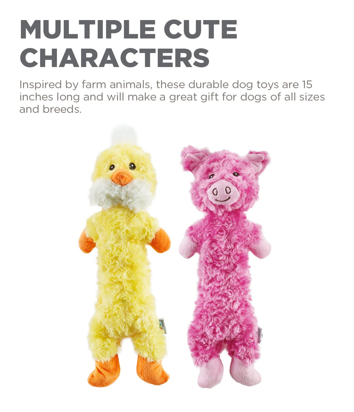 Charming Pet Lil' Dudes are a smaller version of the popular Outward Hound Longidudes. These dog toys are made from soft, plushy fabric on the outside and durable K9 Tuff Guard technology on the inside that includes denier canvas lining, nylon-fused backing, and double stitched seams. Your dog will love shaking, chomping, and tugging the crinkly body that squeaks with every squeeze. Whether you're looking for interactive dog toys or puppy toys, these are great for games of fetch, toss, and catch. Choose from multiple adorable farm animals to find one that fits your pup's personality. Note, Lil' Dudes plush dog toys aren't meant to be used as chew toys. SAFETY & CARE: When choosing a toy, make sure to choose an appropriate size toy for your dog. No toy is indestructible. ALWAYS supervise your dog when using a toy of any kind. Inspect toys regularly for damage and remove and replace if broken, or if parts become separated, as serious injury may result. Intended for dogs only. Keep out of reach of children.