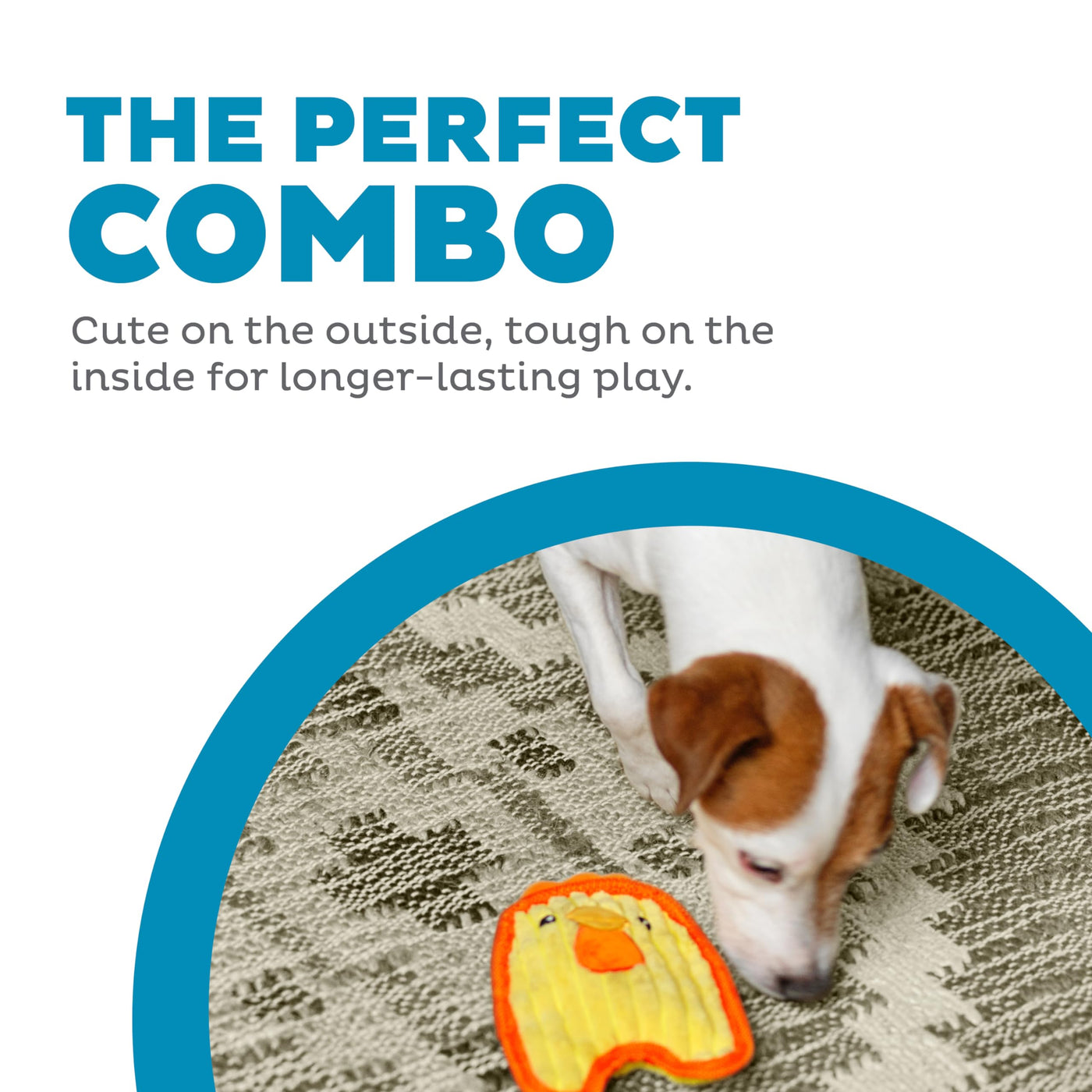 As cute as they are tough, Outward Hound's Durablez longer-lasting plush dog toys are the ultimate combination of cuddly plush and durability to keep your dog entertained. Though colorful and cute, don't let the plush toy exterior fool you. Built to withstand enthusiastic play sessions, each Durablez dog toy is made from Outward Hound's signature K-9 TUFF GUARD complete with strong binding and a tough interior layer of material. This gives the benefit of extended play wrapped in comforting plush dogs simply can't get enough of. Dogs can fetch, toss, and play with their Durablez toys and when the playtime is over, Durablez make the perfect cuddle companions. Durablez dog toys are stuffing-free for all the fun without the clean-up headache, and the irresistible squeakers inside add an extra layer of excitement. The longer the toy, the more squeakers there are, ensuring an engaging experience for your furry friend. Durablez come in various shapes and sizes to suit different dogs, activity levels, and squeaker toy preferences. Next time you're torn between a plush and a durable dog toy, choose the best of both worlds – grab a Durablez longer-lasting dog toy and keep your dog's tail wagging. WARNING:For dogs only. Product contains one continuous thread to enhance durability. If thread unravels, please discontinue use. Keep out of reach of children. When choosing a toy, make sure to choose an appropriate size toy for your dog. No toy is indestructible. ALWAYS supervise your dog when using a toy of any kind. Inspect toys regularly for damage and remove and replace if broken, or if parts become separated, as serious injury may result.