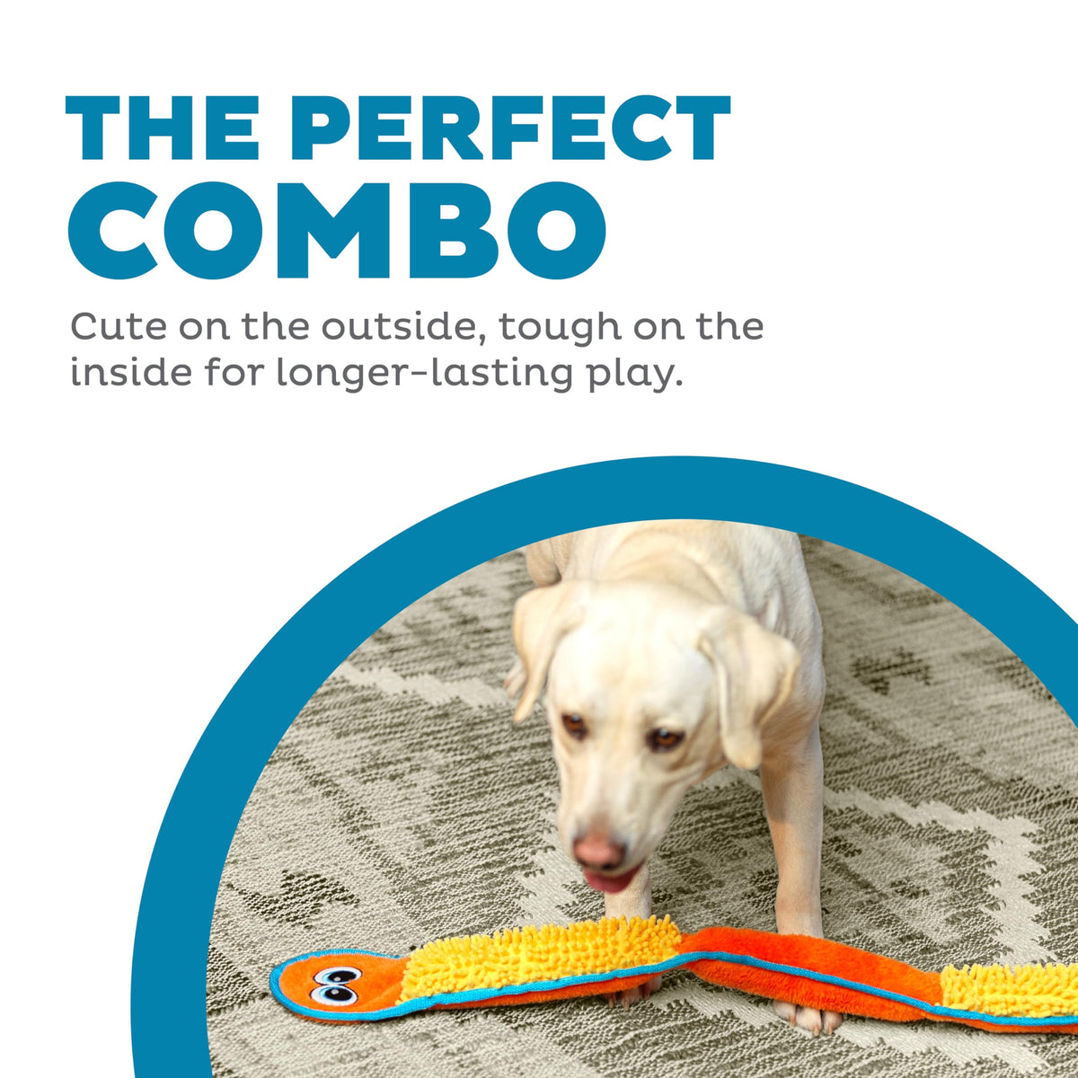 As cute as they are tough, Outward Hound's Durablez longer-lasting plush dog toys are the ultimate combination of cuddly plush and durability to keep your dog entertained. Though colorful and cute, don't let the plush toy exterior fool you. Built to withstand enthusiastic play sessions, each Durablez dog toy is made from Outward Hound's signature K-9 TUFF GUARD complete with strong binding and a tough interior layer of material. This gives the benefit of extended play wrapped in comforting plush dogs simply can't get enough of. Dogs can fetch, toss, and play with their Durablez toys and when the playtime is over, Durablez make the perfect cuddle companions. Durablez dog toys are stuffing-free for all the fun without the clean-up headache, and the irresistible squeakers inside add an extra layer of excitement. The longer the toy, the more squeakers there are, ensuring an engaging experience for your furry friend. Durablez come in various shapes and sizes to suit different dogs, activity levels, and squeaker toy preferences. Next time you're torn between a plush and a durable dog toy, choose the best of both worlds – grab a Durablez longer-lasting dog toy and keep your dog's tail wagging. SAFETY AND CARE: When choosing a toy, make sure to choose an appropriate size toy for your dog. No toy is indestructible. ALWAYS supervise your dog when using a toy of any kind. Inspect toys regularly for damage and remove and replace if broken, or if parts become separated, as serious injury may result. Intended for dogs only. Keep out of reach of children.