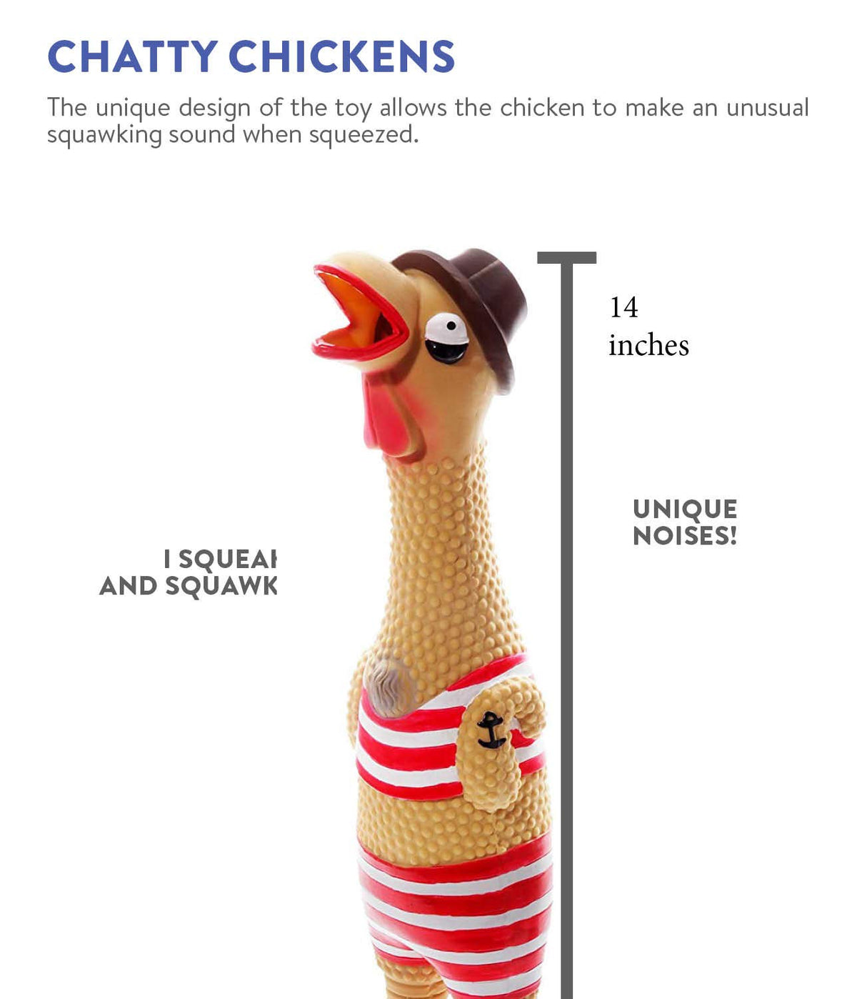 Outward Hound Squawkers Latex Rubber Chickens are a favorite amongst pet owners and pups alike. Made from natural latex rubber and lead-free paint these hilarious dog toys are perfect for playing fetch and other games with your dog! The irresistible squawking squeaker will keep them engaged and mentally stimulated as they chomp and play. Choose from this funny flock of original Squawkers characters or gift a holiday edition dog toy to a beloved furry friend! Available in sizes small and large for all dog breeds.