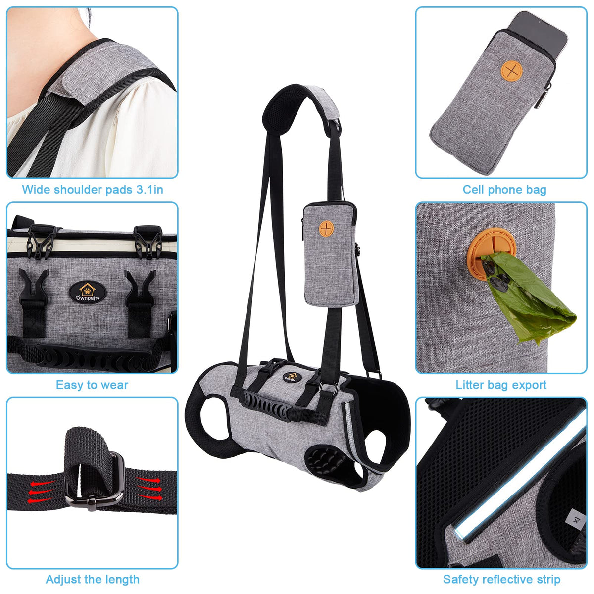 Q: How do I clean the Ownpets Dog Sling Harness?A: The Ownpets Dog Sling Harness is made from durable materials that are washable. To clean it, simply hand wash it with mild soap and let it dry naturally. Avoid using harsh chemicals to maintain the integrity of the fabric.