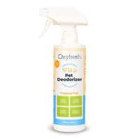 If it smells, we can fix it! Oxyfresh Pet Deodorizer for dogs, cats, birds and all your little critters is loved by pet parents around the world because IT WORKS. Our oxidizing formula with Oxygene breaks down organic odor-causing compounds, leaving absolutely no scent behind. Urine, feces, vomit and even skunk – if it’s a nasty odor, Oxyfresh Pet Deodorizer to the rescue! Our pet freshening room spray delivers peace of mind every time you use it. There are no scents, parabens, alcohol, dyes or toxic chemicals. Instead, our secret ingredient Oxygene neutralizes stinky compounds via the gentle process of oxidation. Smells will be gone in just 60 seconds! No cover-ups with breezy artificial scents. Use as a dog bed spray, kennel odor eliminator, urine odor eliminator, or an air freshener for pet odor wherever stinky smells creep up on you, from garbage cans to litter boxes and beyond. Because it’s non-toxic, you can use this deodorizer for home or business directly on pets. It’s so easy! To eliminate pet odors, just spray and walk away; even carpets just need a light misting. No residue left behind, no rinsing or blotting. Perfect for dog bedding, clothing, in and around litter boxes, kennels, bird or animal cages, etc. It can also be applied directly on the pet. Oxyfresh Pet Deodorizer is dye-free and safe for all surfaces. Just check for color fastness on delicate materials.