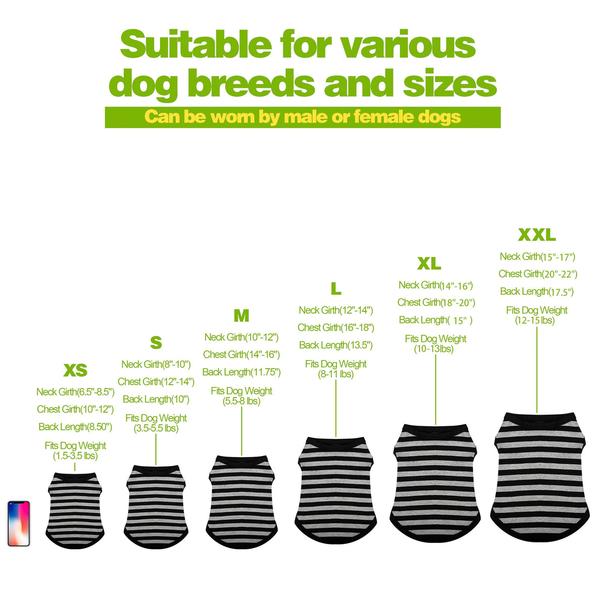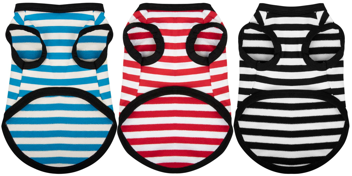 Material: These dog shirts are made of high-quality cotton material, which is soft, comfortable, and breathable. This makes it easy for your furry friend to wear them for long periods without feeling irritated or uncomfortable. | Design: The shirts come in a sleeveless tank top design that allows for easy movement and flexibility. The striped patterns add a stylish touch to your dog's wardrobe, making them look cute and fashionable. | Stylish: The colorful striped patterns on these shirts make them stylish and eye-catching. They can be worn on their own or paired with other accessories, such as dog collars or bows, to create a complete look. | Sizes: These shirts are available in different sizes to fit small to medium-sized dogs. Be sure to measure your dog's chest and neck girth before purchasing to ensure the best fit. The size chart can help guide you in choosing the right size for your pup. | Versatility: These shirts can be worn all year round. During colder months, they can be used as a sweatshirt to keep your dog warm and cozy. During warmer months, they can be worn as standalone apparel to keep your dog cool and comfortable. | Great for Outdoor Activities: These shirts are perfect for outdoor activities such as walks or hikes. The breathable material helps keep your dog comfortable and cool, while the sleeveless design allows for maximum movement and flexibility. | Easy to Wear: The sleeveless design and stretchable material make it easy to put on and take off these shirts. This is especially helpful for pet owners who may have trouble dressing up their dogs due to wriggling or squirming. | Cleaning: These shirts are easy to clean and maintain. They can be washed by hand or machine washed on a gentle cycle. Always use mild detergent and avoid using bleach or fabric softener to prevent damage to the material. | Suitable for a wide range of dog breeds: These shirts are suitable for a variety of dog breeds, including Chihuahuas, Pugs, Shih Tzus, Young French Bulldogs, and more. However, it's important to choose the right size to ensure a comfortable and secure fit. | Quantity: This set comes with Three pieces of dog shirts, Available in 3 colors - black,red,blue,providing a good value for pet owners who want to stock up on clothes for their furry friends.