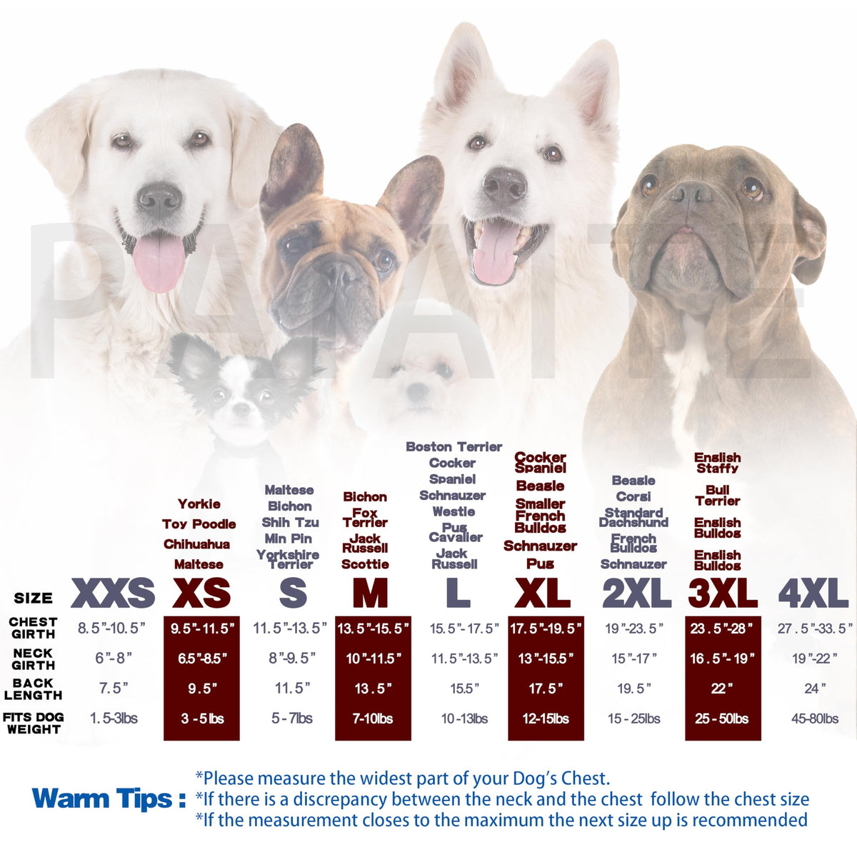 Size Chart Size Xs:------Neck Girth(6.5'-8.5')--------Chest Girth(10'-12')-------Back Length(8.50')------Fits Dog Weight(1.5-3.5 Lbs) Size S:-----Neck Girth(8'-10')----------Chest Girth(12'-14')-------Back Length(10')---------Fits Dog Weight(3.5-5.5 Lbs) Size M:------Neck Girth(10'-12')---------Chest Girth(14'-16')-------Back Length(11.75')------Fits Dog Weight(5.5-8 Lbs) Size L:----Neck Girth(12'-14')---------Chest Girth(16'-18')-------Back Length(13.5')------Fits Dog Weight(8-11 Lbs) Size Xl:---Neck Girth(14'-16')---------Chest Girth(18'-20')-------Back Length(15')------Fits Dog Weight(11-15 Lbs) Size Xxl:---Neck Girth(15'-17')---------Chest Girth(20'-22')-------Back Length(17.5')------Fits Dog Weight(15-19 Lbs) Paiaite Is A Premium Dog Clothes Brand Dedicated To Providing The Best Clothing Options For Your Beloved Furry Companions. We Understand That Your Dog Is Not Just A Pet, But A Cherished Member Of Your Family, And As Such, We Believe They Deserve Only The Best. Our Brand Is Committed To Offering High-Quality Dog Clothing That Not Only Looks Great But Also Provides Comfort And Functionality. Each Piece Of Clothing Is Made With The Utmost Care And Attention To Detail, Using Only The Finest Materials To Ensure Durability And Longevity. Whether You Are Looking For A Cozy Sweater To Keep Your Dog Warm On A Chilly Day Or A Stylish Jacket For A Special Occasion, Paiaite Has Something For Every Occasion. Our Extensive Range Of Clothing Options Ensures That Your Furry Friend Will Look Their Best, No Matter What The Occasion. At Paiaite, We Believe That Every Dog Deserves To Be Treated Like Royalty, And We Are Committed To Making This A Reality For All Our Customers. So Why Not Give Your Dog The Royal Treatment They Deserve And Check Out Our Collection Today?