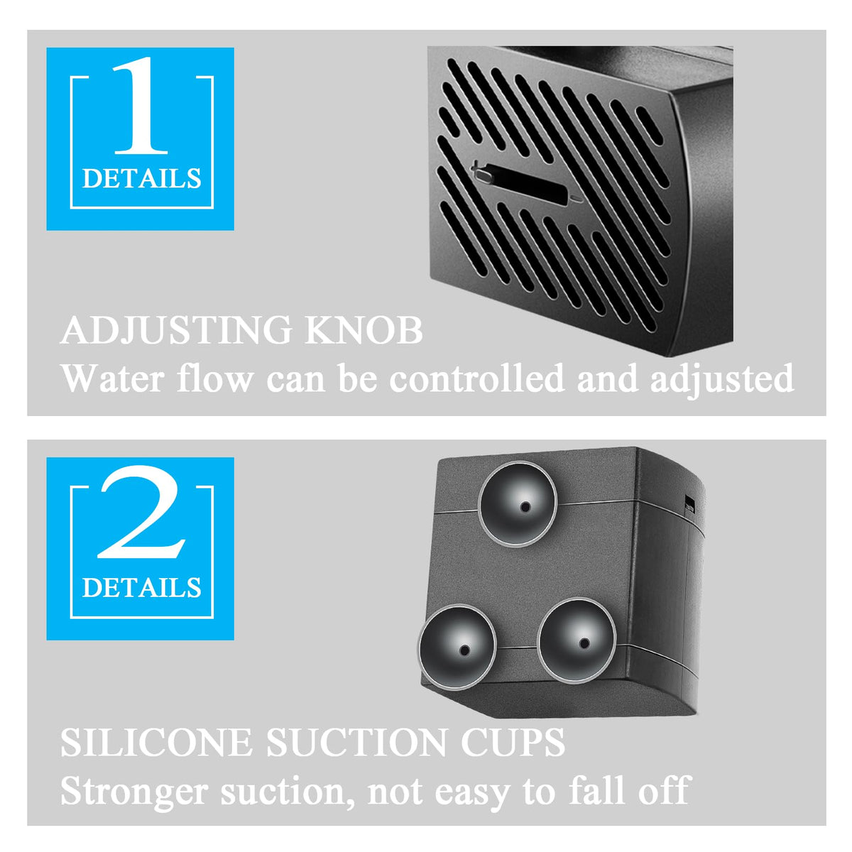 Whats the features of our Small Fountain Pump? Water Flow Control:An Adjustable Knob to control the water flow rate, you can you to customize the water flow rate to suit your preferences and needs. Ultra-quiet: Ultra-quiet design ensures a peaceful environment while providing efficient water flow for your pond or fountain. Widely Applied: This submersible pump is perfect for aquarium, fountains, spout and hydroponic systems. Detachable & Cleanable: No need any tools to detach it, easy to seperate, easy to clean. What does the submersible pump package contain? Submersible pump with suction cups Tubing