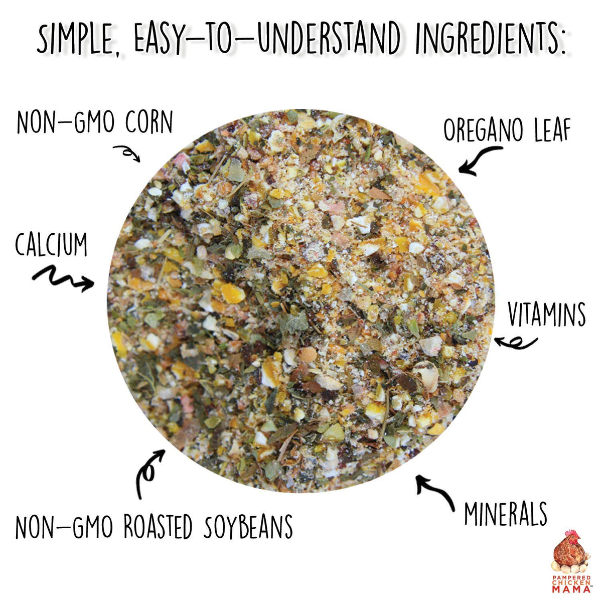 Q: What are the main ingredients in the Pampered Chicken Mama Molting Supplement?A: The main ingredients include one hundred percent pure, non-GMO soybean meal, non-GMO corn, dried oregano, apple cider vinegar granules, probiotics, and vitamins.