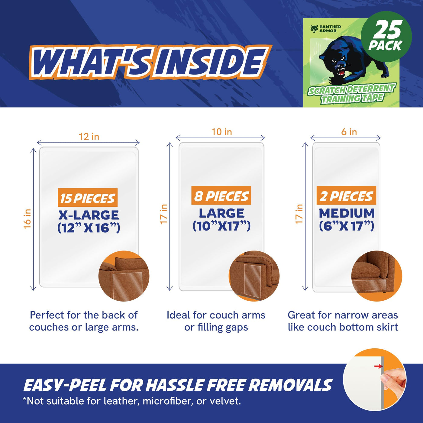 Q: What sizes do the Panther Armor Cat Scratch Protectors come in?A: Each pack includes 25 large sheets in three versatile sizes, with the largest sheet measuring 16" x 12". This comprehensive coverage system allows you to protect various furniture pieces, from couches to carpets.
