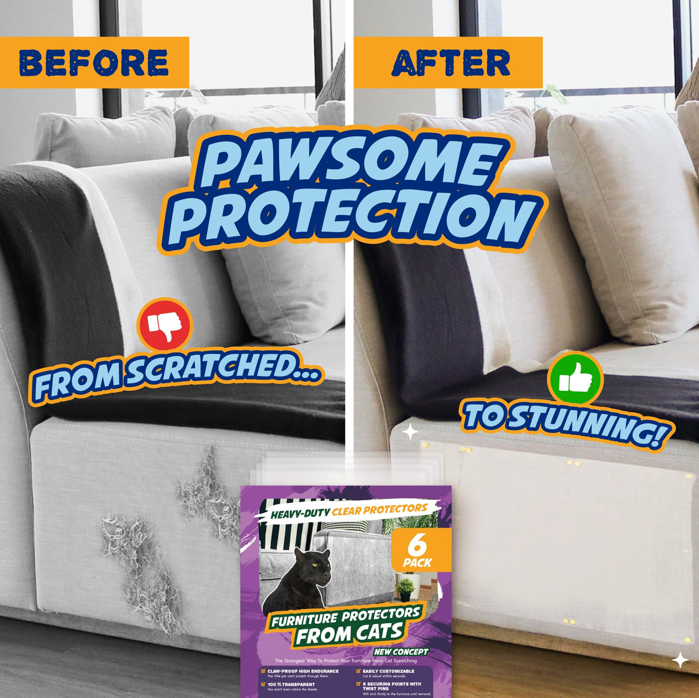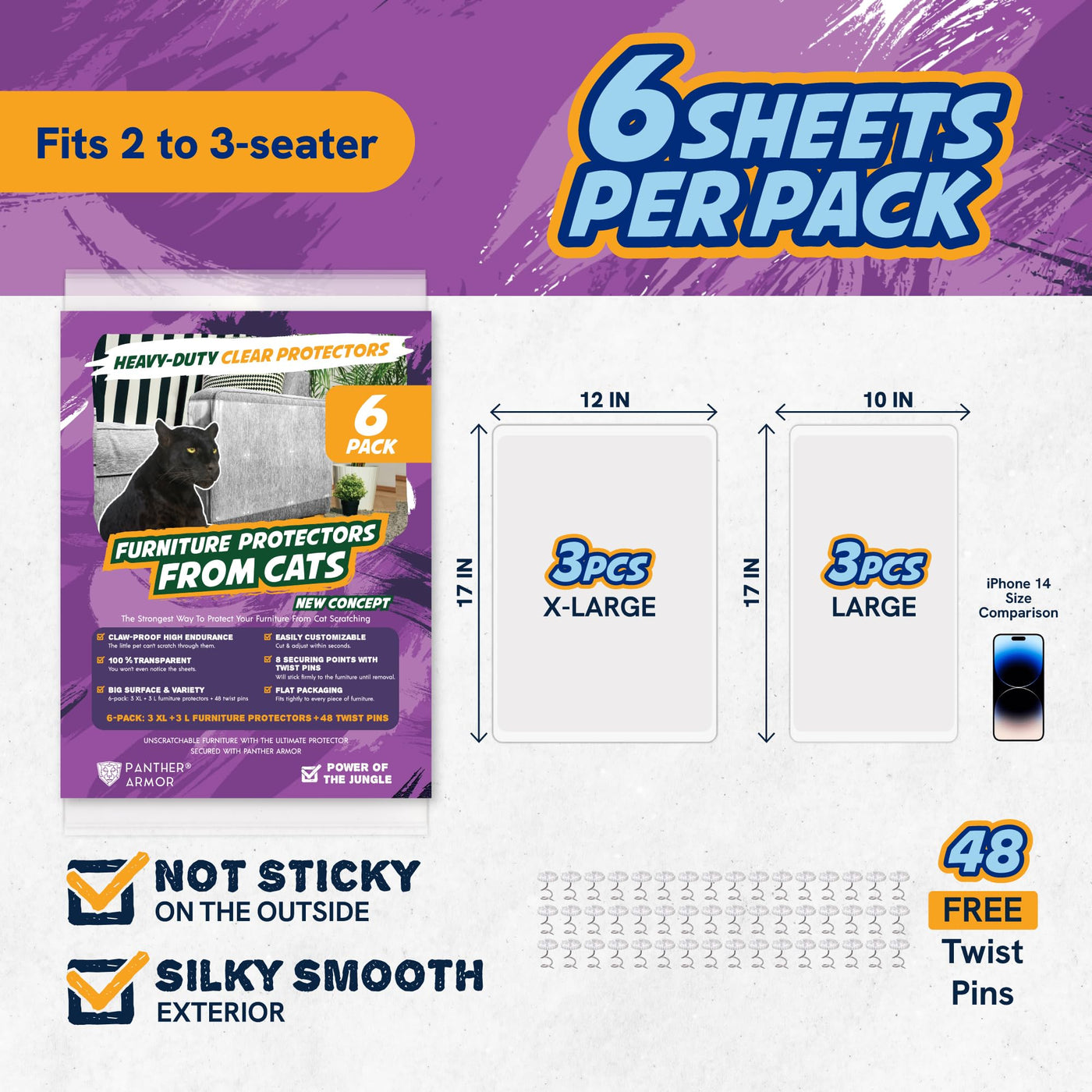 Q: How do the Panther Armor Furniture Protector Sheets prevent cat scratches?A: The Panther Armor Furniture Protector Sheets feature a one-sided sticky design that effectively deters cats from scratching your furniture. The combination of adhesive sheets and twist pins ensures that the protectors stay firmly in place, providing a reliable barrier against cat claws.