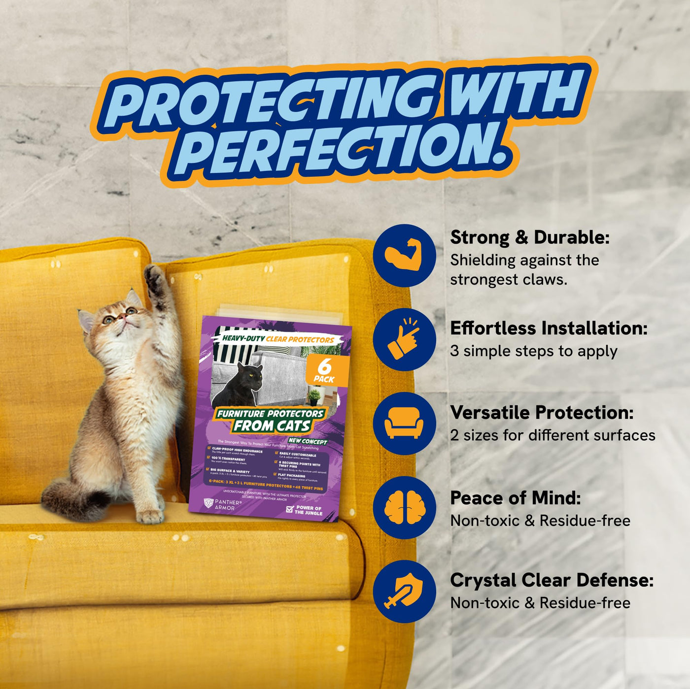 Panther Armor promises to protect your furniture while keeping your cat’s claws safe. The furniture protectors cover the highest surface from the anti scratcher products. Will They Stick on My Couch? Yes, indeed. The combination of adhesive sheets and the numerous twist pins guarantee that the sheets will stick firmly for a long time. After the removal, none of them will do damage to the furniture. Panther Armor will train your small pet to stop scratching the furniture even after you remove the sheets. 100% Money Back Guarantee. Our promise is to prevent your cat from scratching the furniture. If by any reason, you’re not satisfied with Panther Armor, you will receive a full refund, no questions asked..