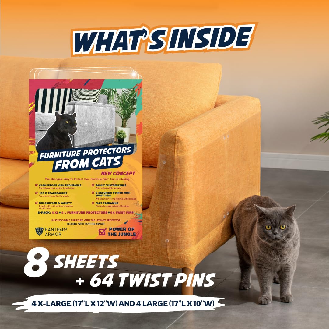 ??? SHIELD YOUR FURNITURE FROM CAT SCRATCHES! ?? Say goodbye to furniture scratches caused by those feisty claws with our Cat Scratch Furniture Protectors! Designed to protect your beloved couch and chairs, our set includes 4 X-Large (17'L x 12'W) and 4 Large (17'L x 10'W) transparent protectors, fitting seamlessly into any furniture size without compromising your decor. Installation is a breeze with 64 twist pins included to ensure a secure fit, letting your furry friends play freely without worry. Your pets' safety is paramount, which is why our furniture protectors are pet-approved and residue-free after removal. Enjoy a scratch-free home with the confidence of our 100% satisfaction guarantee - if they don't work for you, we'll refund or replace them. Embrace a harmonious living space where your furniture stays beautiful and scratch-free! ????