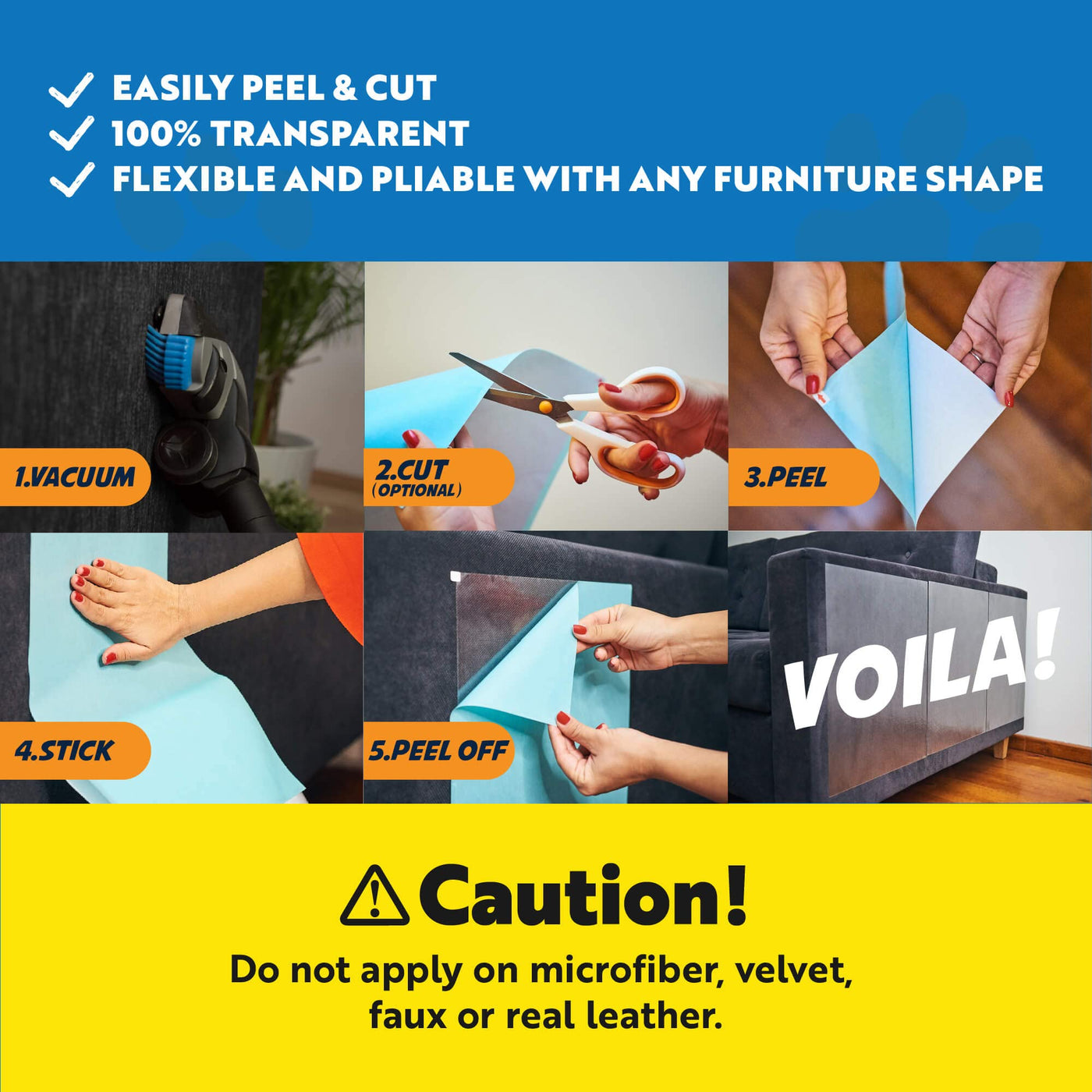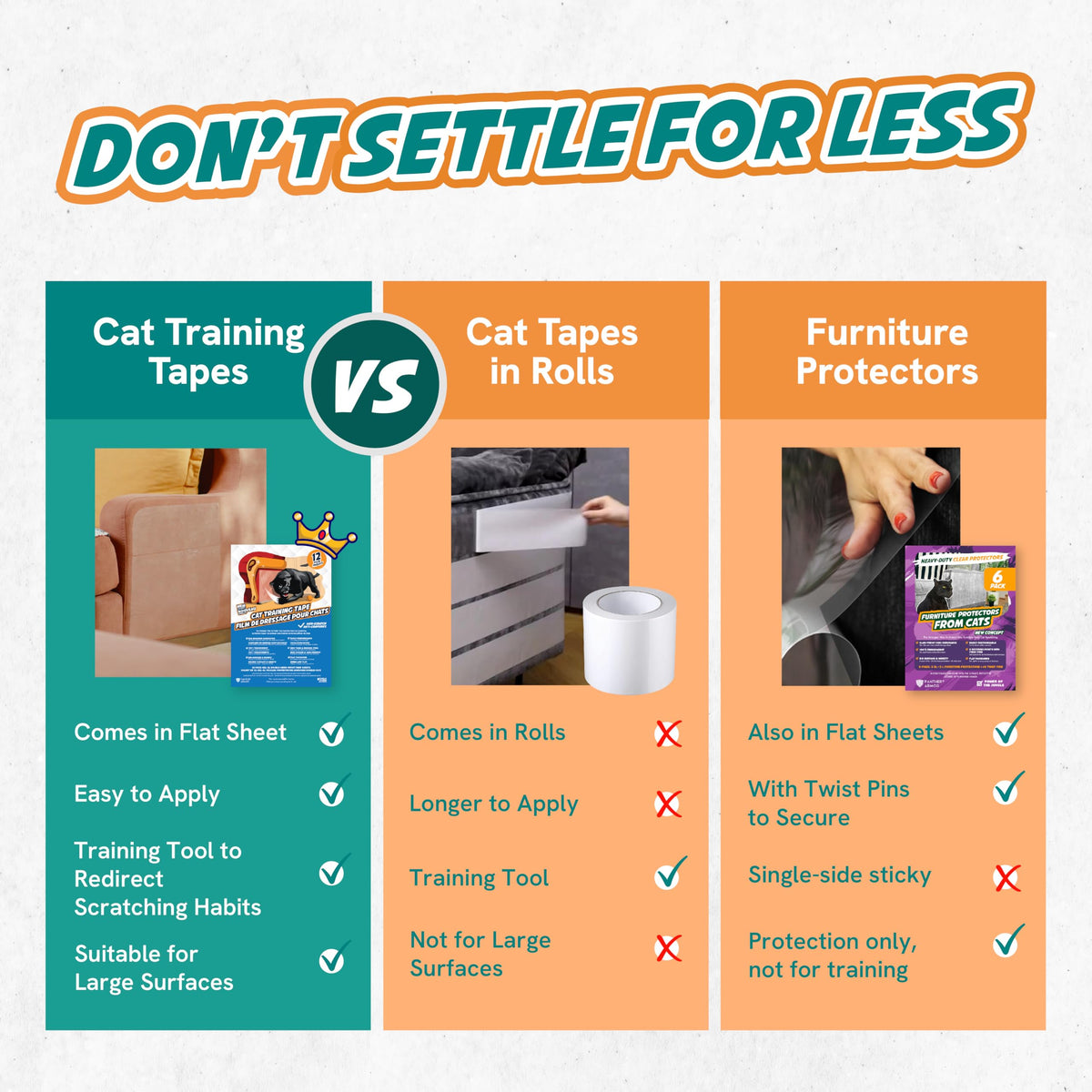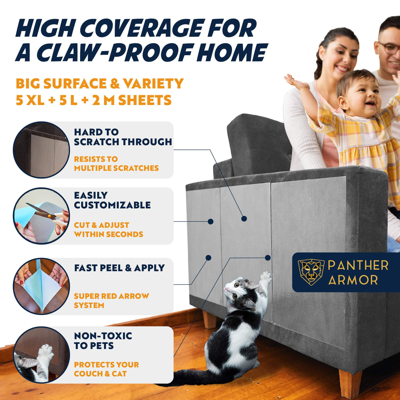 strong>Keeping cats claws Safestrong> Panther Armor promises to protect your furniture while keeping your catAs claws safe strong>WhatAs the Sizestrong> The double-sided cat scratch deterrent tape 5 PcS XL 16AL 12AW + 5 PcS Large 17AL 10AW + 2 PcS M 17AL 6AW covers a considerably high size meeting any household needs strong>Will They Stick Well on My couchstrong> Your sofa has never been safer The adhesive is just enough to stick well on any furniture and still not to produce any damage or leave any sticky residue strong>Is This a Real Problem Solverstrong> Say no more Panther Armor anti-scratch cat training tape teaches your pet to never step anywhere near the affected area Our furniture protector is both a quick fix and a long-term solution in cat claw damage prevention strong>Where Should I Use Themstrong> To sum up: wherever your cat scratches The 100% clear repellent sheets are designed to be applied on almost everything: any side of the upholstered couch sofa corners chair carpet door etc *We recommend to first test a small piece on a hidden area strong>Why choose Our Furniture Protectors From catsstrong> Panther Armor is a well-established brand in this industry offering many furniture protection products from tapes to premium vinyl sheets Say goodbye to the old-fashioned strips choose the best scratch guards and keep the cats or dogs away from your precious furniture strong>100% Money-Back guaranteestrong> Our promise is to stop & prevent your cat from scratching the furniture If for any reason youAre not satisfied with Panther Armor you will receive a full refund no questions asked strong>*Not recommended for velvet faux or real leatherstrong> choose wisely Why worry for clawing when you shouldnAt
