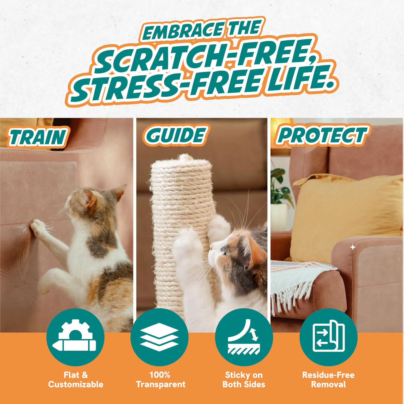 ENJOY A ScRATcH-FREE HOME Reclaim your furniture with our cat Scratch Deterrent & Training Tape This flat-sheet double-sided sticky tape swiftly trains your cat to stop scratching your valuable sofa WIDER cOVERAgE & MESS-FREE No more tedious cutting or mess Our flat sheets offer wider coverage per sheet simplifying the process of protecting your furniture Its training made easy THREE SIZES FOR VERSATILE USE Our pack includes 12 sheets in 3 sizes - 5 XL 5 L and 2 M - perfect for different furniture surfaces Keep your entire home scratch-free with this convenient duo STRONg ADHESION & RESIDUE-FREE REMOVAL Our tapes strong adhesion ensures it stays put delivering consistent results And when its time to remove bid farewell to any sticky residue with our unique formula SATISFAcTION gUARANTEE Your satisfaction is our priority We offer a 100% satisfaction guarantee allowing you to train your cat without worries Experience a scratch-free home today