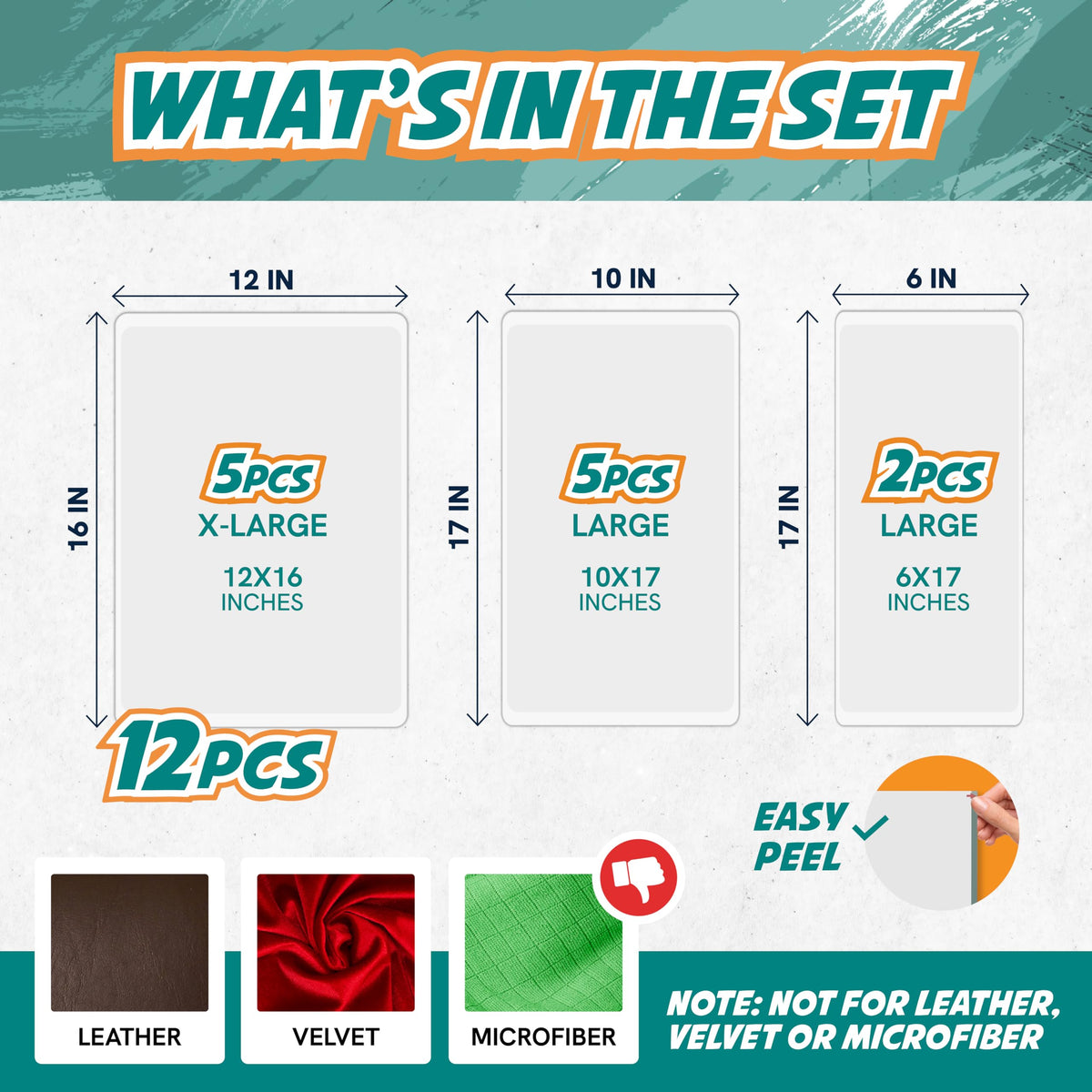 Q: What sizes are included in the 12-pack of sticky tape?A: The 12-pack includes 5 extra-large sheets (16x12 inches), 5 large sheets (17x10 inches), and 2 medium sheets (17x6 inches). This variety allows you to cover different types of furniture with ease.