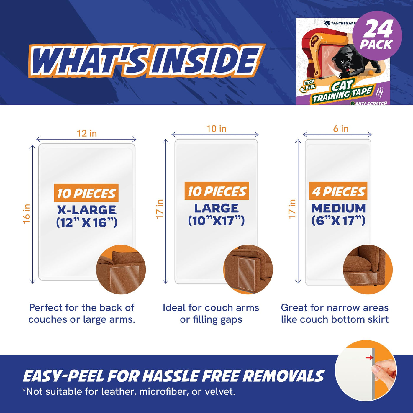 ?? Maximum Protection With Our 24-Pack ??? Protect Your Home To The Fullest With Our 24-Pack Cat Scratch Deterrent & Training Tape! Boasting 10 Xl (16X12 Inches), 10 L (17X10 Inches), And 4 M (17X6 Inches) Sheets, No Scratch Is Left Unaddressed. Enjoy The Convenience Of Wider Coverage Without Messy Cutting. Our Tape'S Strong Adhesion Ensures It Stays In Place, Effectively Training Your Cat To Stop Scratching. And When It'S Time For Removal, Use A Hairdryer For Residue-Free Results.