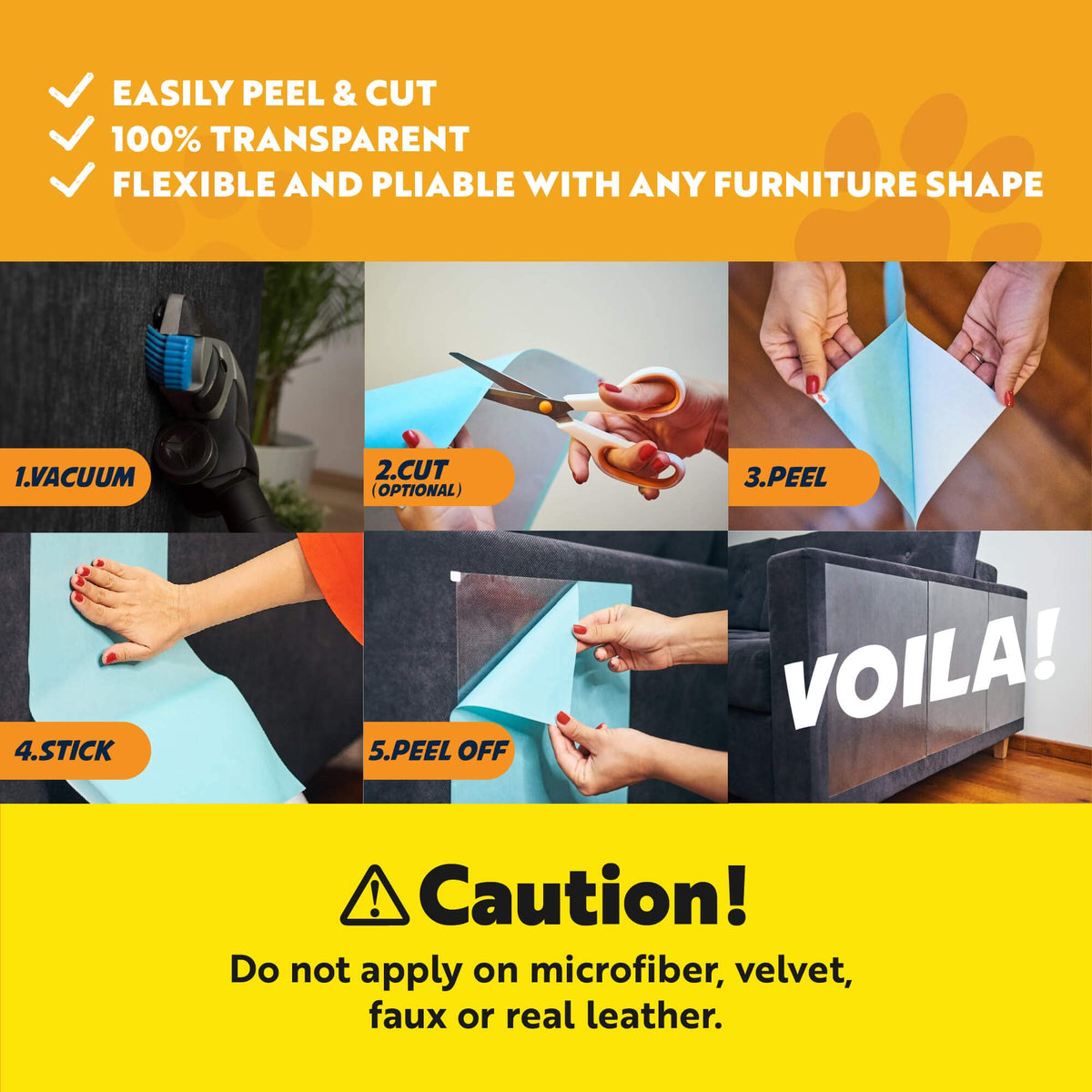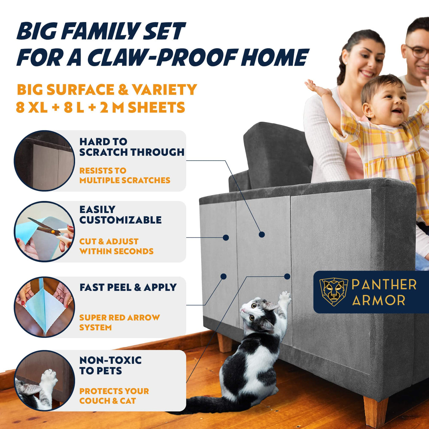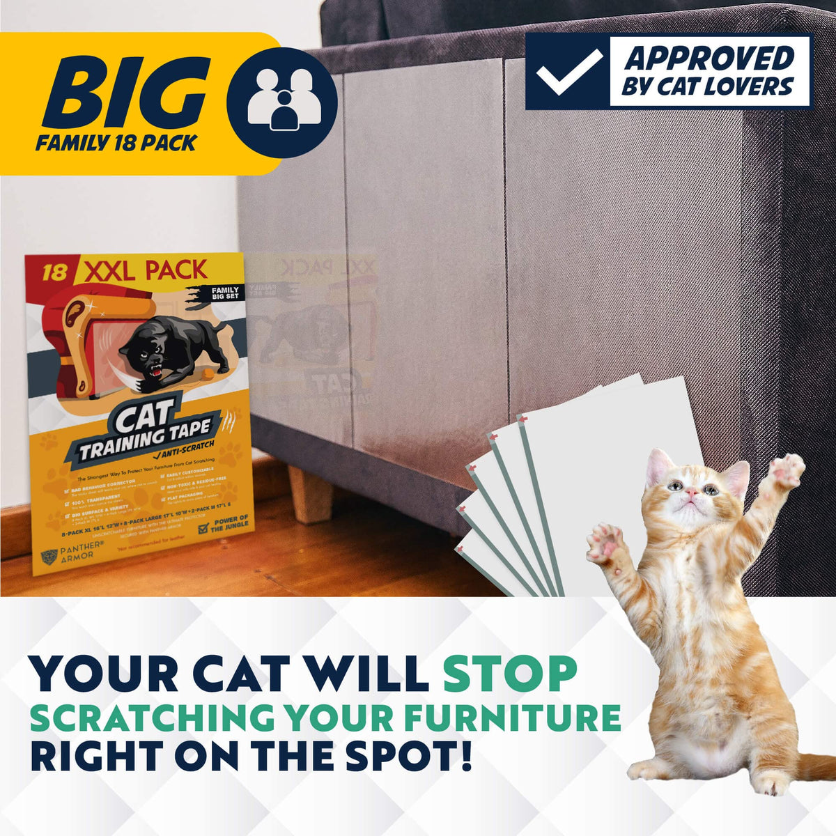 TRAIN YOUR cAT INSTANTLY ] The Panther Armor double-sided sticky cat tape is here to help The cat furniture protector sheets are packed flat & easily pliable on any corner The 8 XL 16AL 12AW 8 L 17AL 10AW and 2 M 17: 6W anti-scratch tape sticky sheets provide a big cover surface for cat scratching prevention Training your cat may be the best investment in protecting your furniture Apply the anti cat scratch tape on any upholstered couch chair doors carpet door frame etc INSTALL AND FORgET ] Stick the anti scratch furniture protector sheets and let them do the job for you The sticky side will annoy your kitty so much that you wonAt see the little pet near your furniture any time soon Stop the cat claw damage on your sofa with Panther Armor - non-toxic 100% safe tape The product is residue-free and does not harm the furniture after removal Protect your furniture & keep your catAs claws healthy and safe choose our cat scratch furniture protector VERY EASY TO APPLY ] The 100% clear couch protector for cats will blend instantly with furniture The couch cat scratch protector takes no more than 5 mins of your time for installation thanks to our Asuper easy-peel systemA 1 Quickly vacuum the area 2 cut the protectors and adjust their size 3 Peel away the white backing 4 Stick the adhesive where you want to protect 5 Peel away the blue backing Voila The best protection on your furniture No more cats will AstickA around PREVENT & PROTEcT ] The cat scratch deterrent tapes are highly effective due to their size and sticky material They immediately STOP & PREVENT the cats or dogs to scratch through them Say goodbye to the old-fashioned strips YouAve had enough of cat clawing your sofa The scratches wonAt be a problem once you teach your cat where not to scratch by using PANTHER ARMOR scratch guards products Please note: We do not recommend applying the cat couch protector to leather velvet or microfiber 100% MONEY BAcK gUARANTEE ] WeAre dedicated to offering the best products to keep your cat off the furniture The furniture items will suffer NO DAMAgE when the plastic furniture protectors from cats repellent sheets are removed We made sure the furniture defender sticky pads meet the highest standards of quality but if for ANY reasons you are not satisfied you will receive a refund no questions asked Use our couch scratch protector from cats click on the Add to cart button NOW