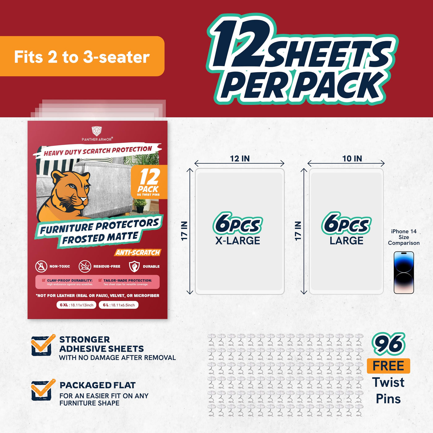 Say goodbye to unsightly furniture scratches caused by those feisty claws with Panther Armor Frosted Matte Furniture Protectors crafted to preserve your beloved couch and chairs our set includes 12 frosted matte sheets and 96 pins for a secure fit Worried about protectors clashing with your decor No need Our frosted matte design adds a touch of elegance while seamlessly fitting into any furniture size Plus theyre designed for easy and secure installation with included pins so your furniture remains scratch-free We understand your fur babies are precious so our pet-friendly furniture protectors are residue-free after removal ensuring everyones happiness and safety And of course our 100% satisfaction guarantee ensures your peace of mind If our furniture protectors dont meet your expectations well gladly refund or replace them because were committed to a scratch-free life