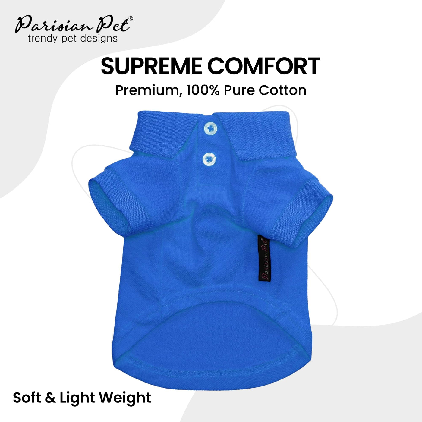 Parisian Pet Dog Polo Shirts - Breathable Cotton Shirt - Solid Blue, Summer Pullover - Button Up Collar Polo For Medium Dogs