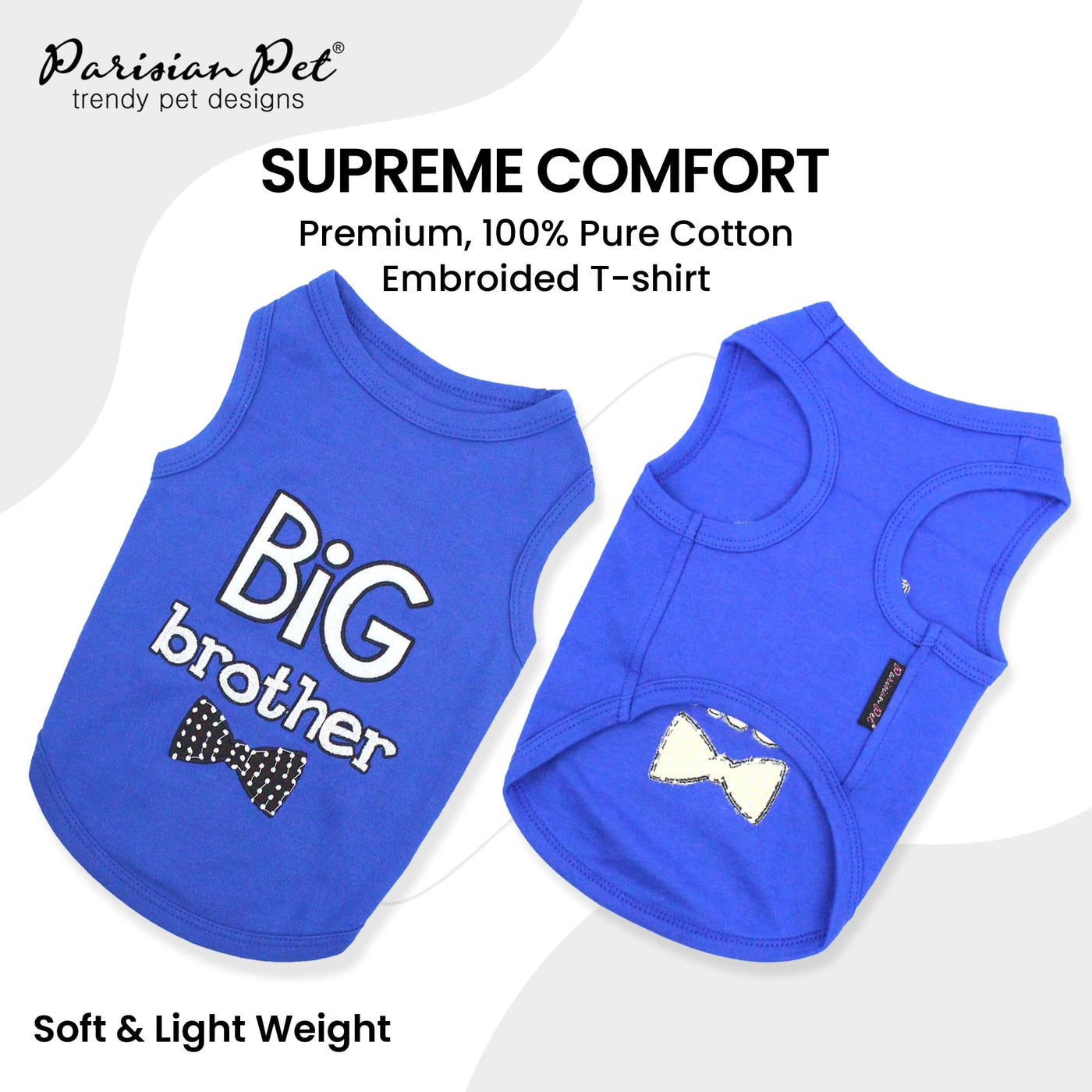Parisian Pet Dog T-Shirt With Embroidered ' Big Brother ' Words - Breathable, Cotton, Big Brother Dog Shirt - Sleeveless Pet Vest - Blue Dog Clothes For Medium-Sized Dogs, M