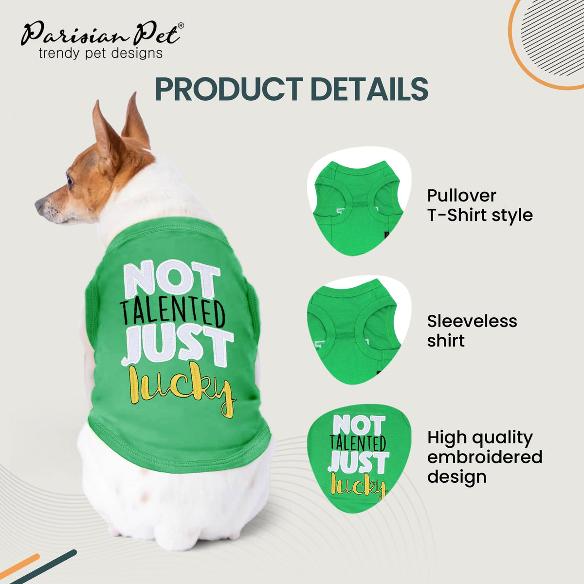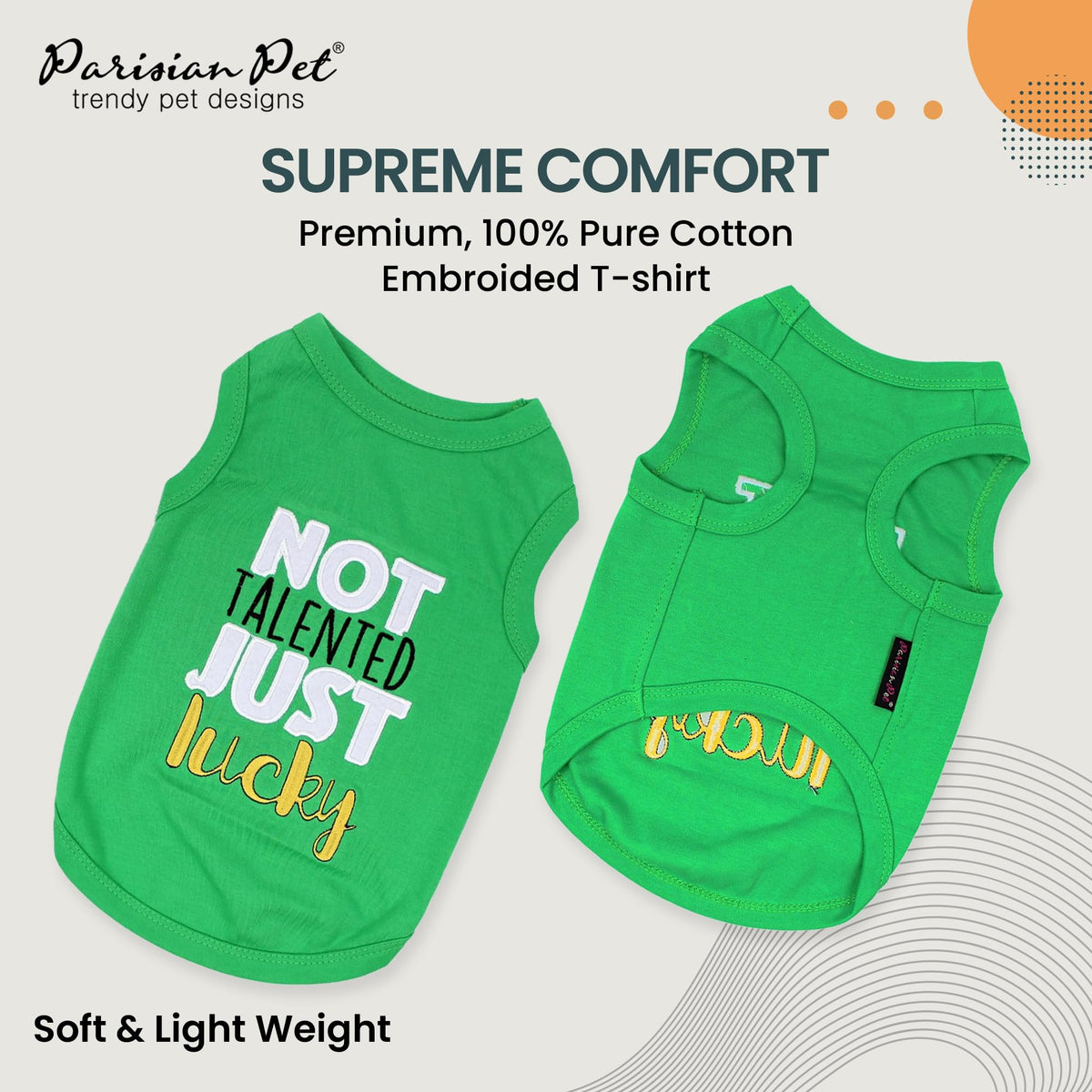 Parisian Pet Dog Tshirt - Embroidered Not Talented Just Lucky Dog Clothes - 100% Cotton Pet Vest - Sleeveless Green Tee Shirts