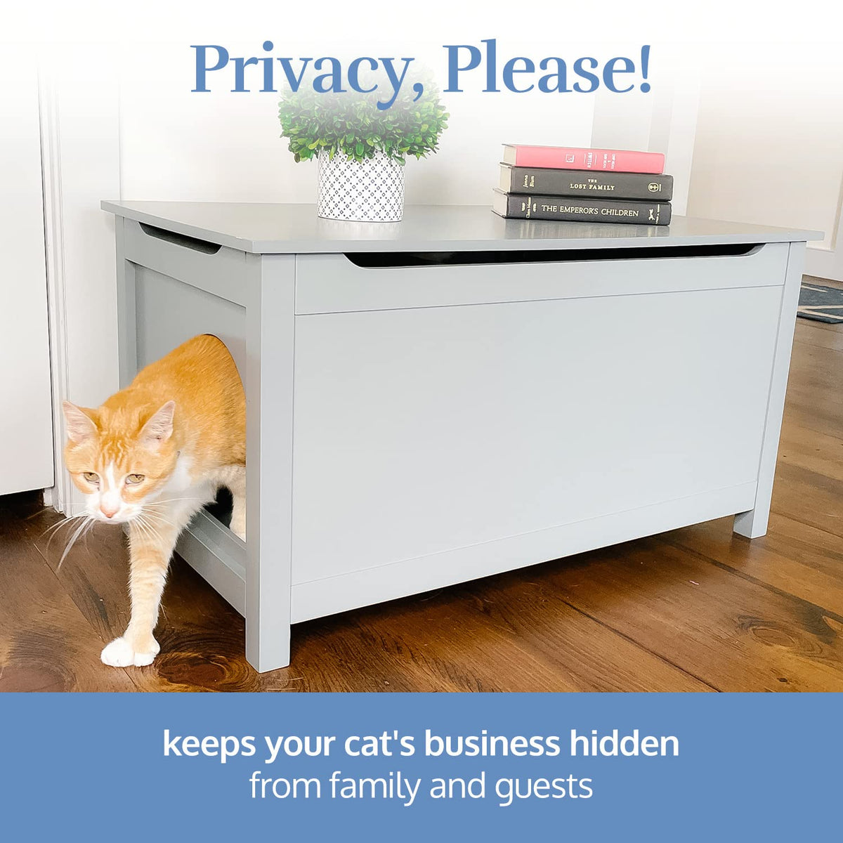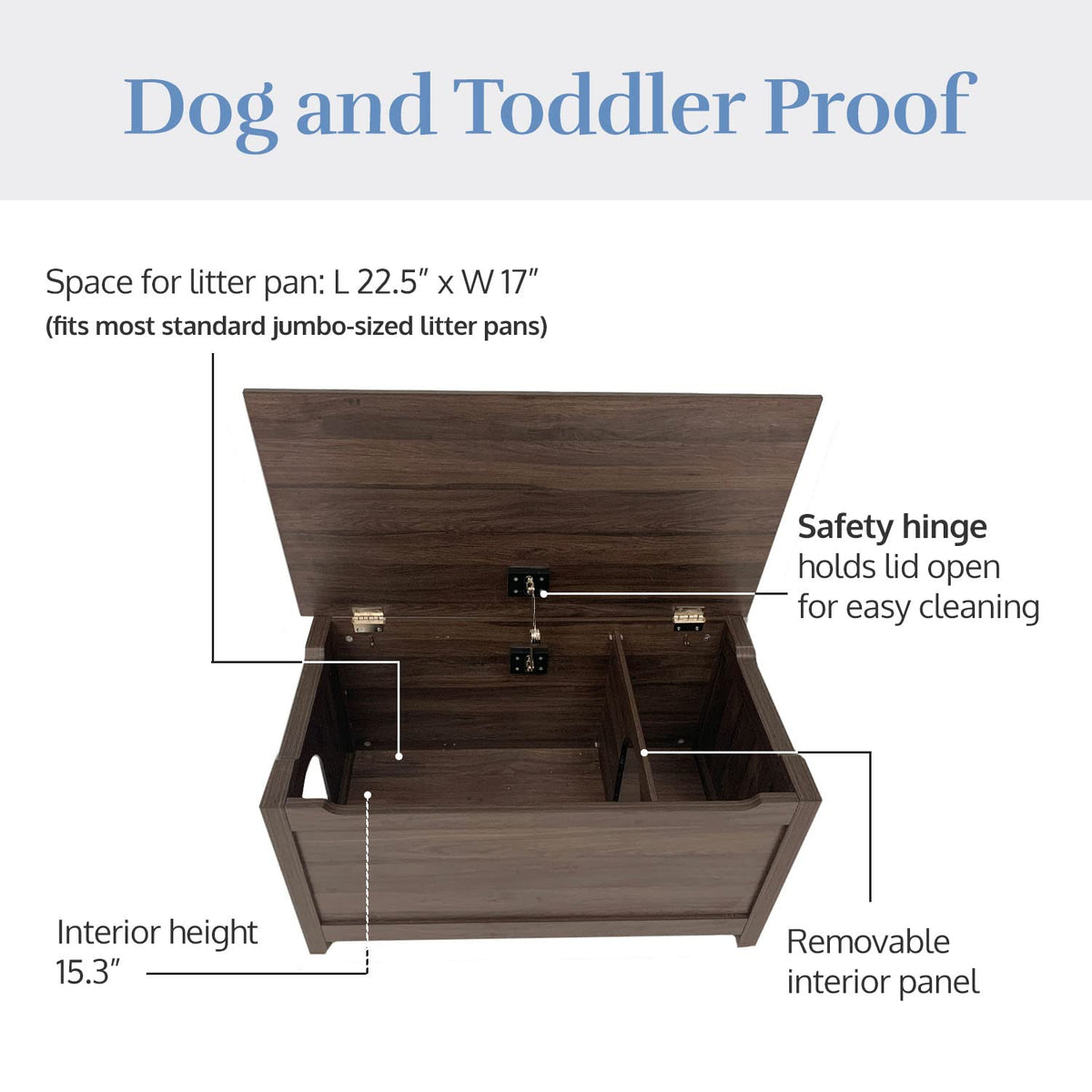 Q: Can this litter box enclosure keep my dog away from the litter?A: Absolutely! The innovative design of the Parker Catbox includes an outer and interior panel that helps keep nosy dogs away from the litter pan, ensuring a safe environment for both pets and toddlers.
