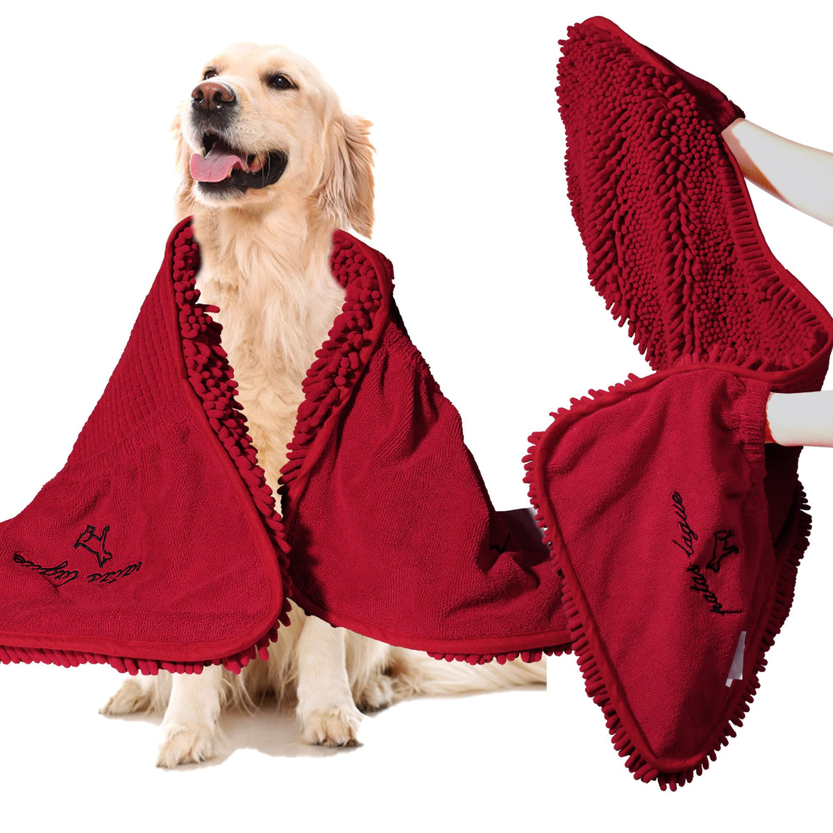 Patas Lague Absorbent Dog Towel For Drying Dogs Large, 35 x15 Extra Large Microfiber Quick Drying Pet Bath Towel with Hand Pockets, Machine Washable Pet Shammy Wine Red.