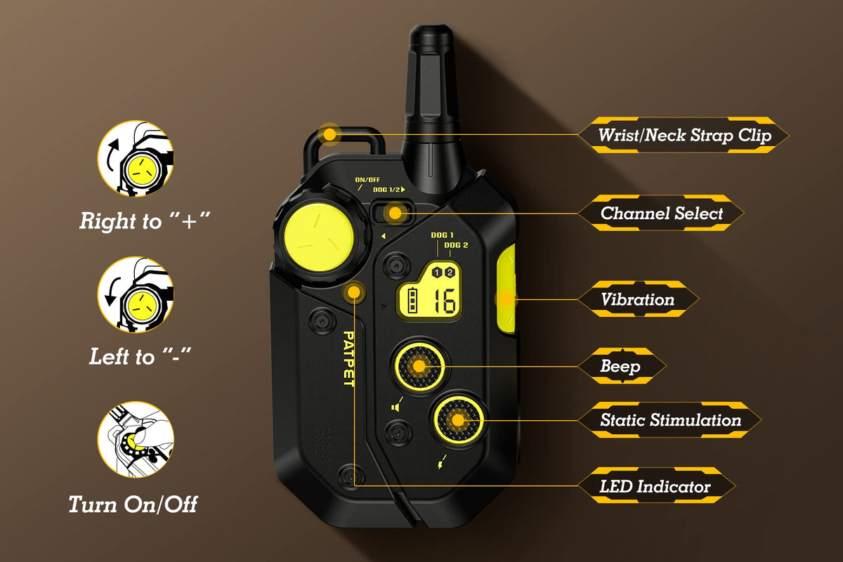 Ideal for training stubborn dogs. With 2 channels and 3 training modes (beep vibration and 16 levels of static stimulation) this electric dog shock collar is designed for professional trainers and supports simultaneous control of 2 dogs.