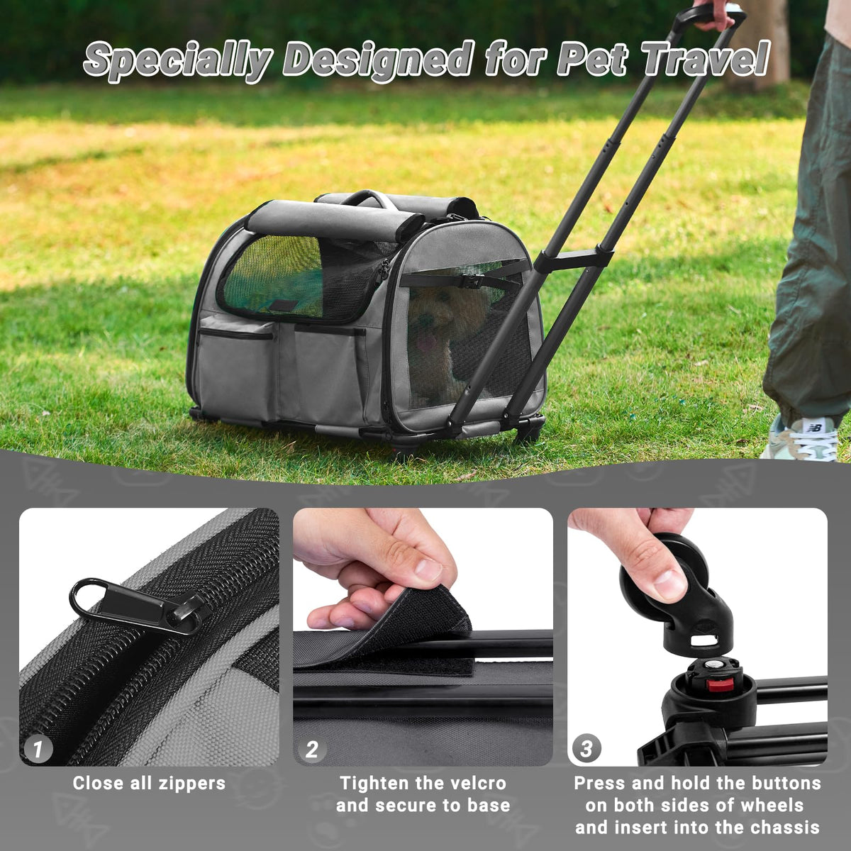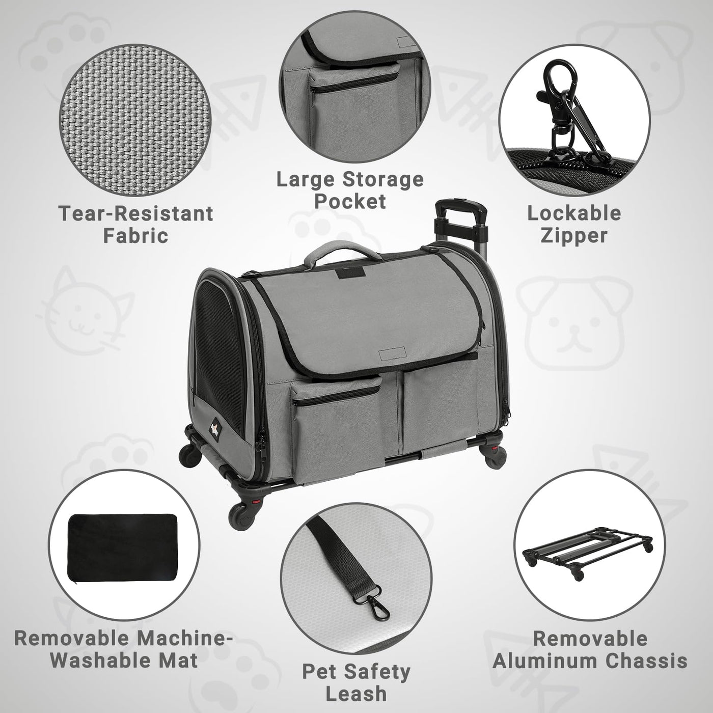 Paw Ballet Large Cat Carrier With Wheels, Foldable Rolling Pet Dog Carrier With Wheels And Big Pocket, Cat Carrier Travel Bag For 2 Cats Dogs Under 30 Lbs For Outdoor Vet Visits, Gray