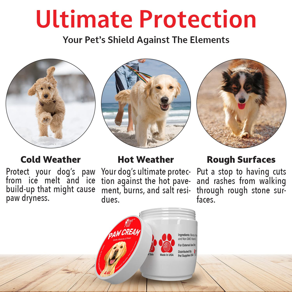 Q: How does this product protect against heat and cold?A: Paw Pull's paw cream creates a protective barrier on your dog's paws, shielding them from extreme temperatures. It prevents burns from hot pavement in summer and protects from dryness and irritation caused by snow and ice in winter.