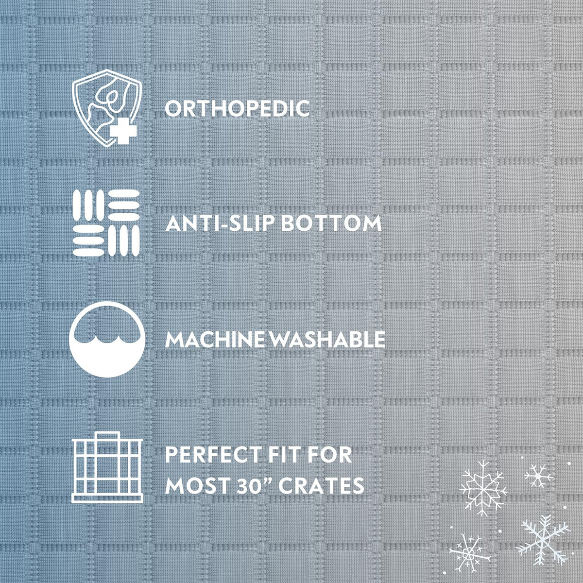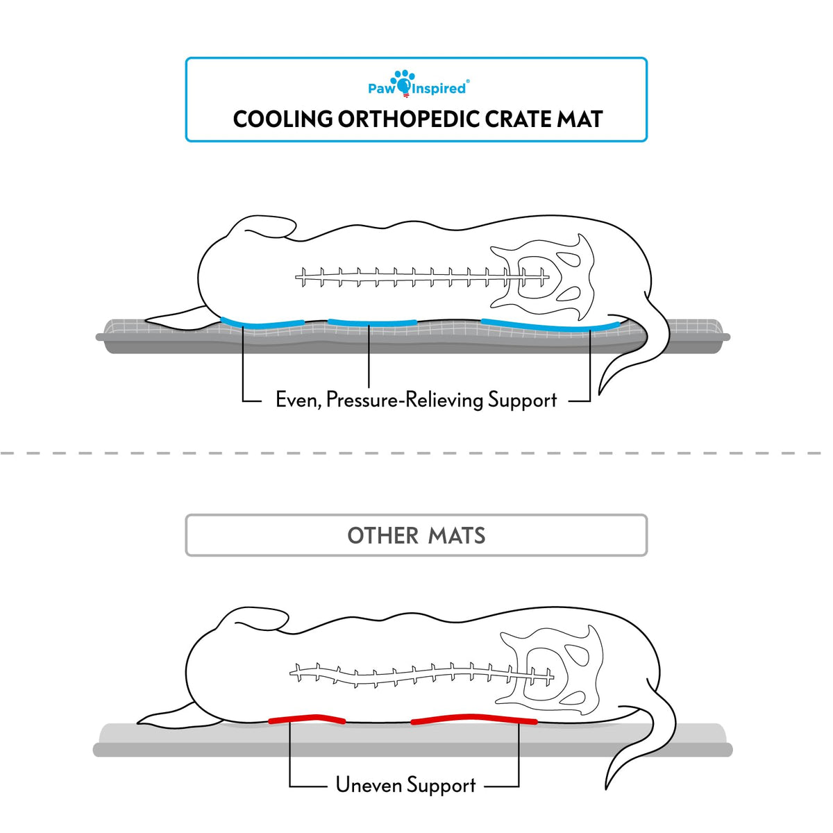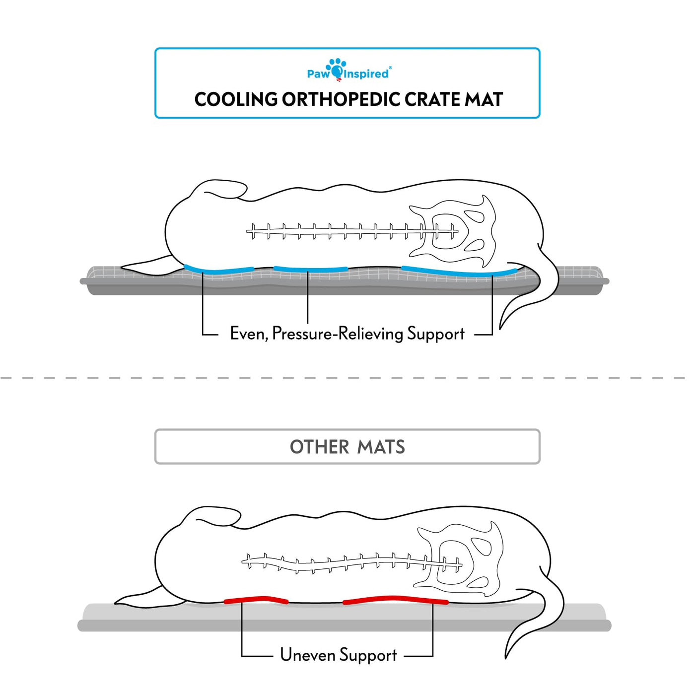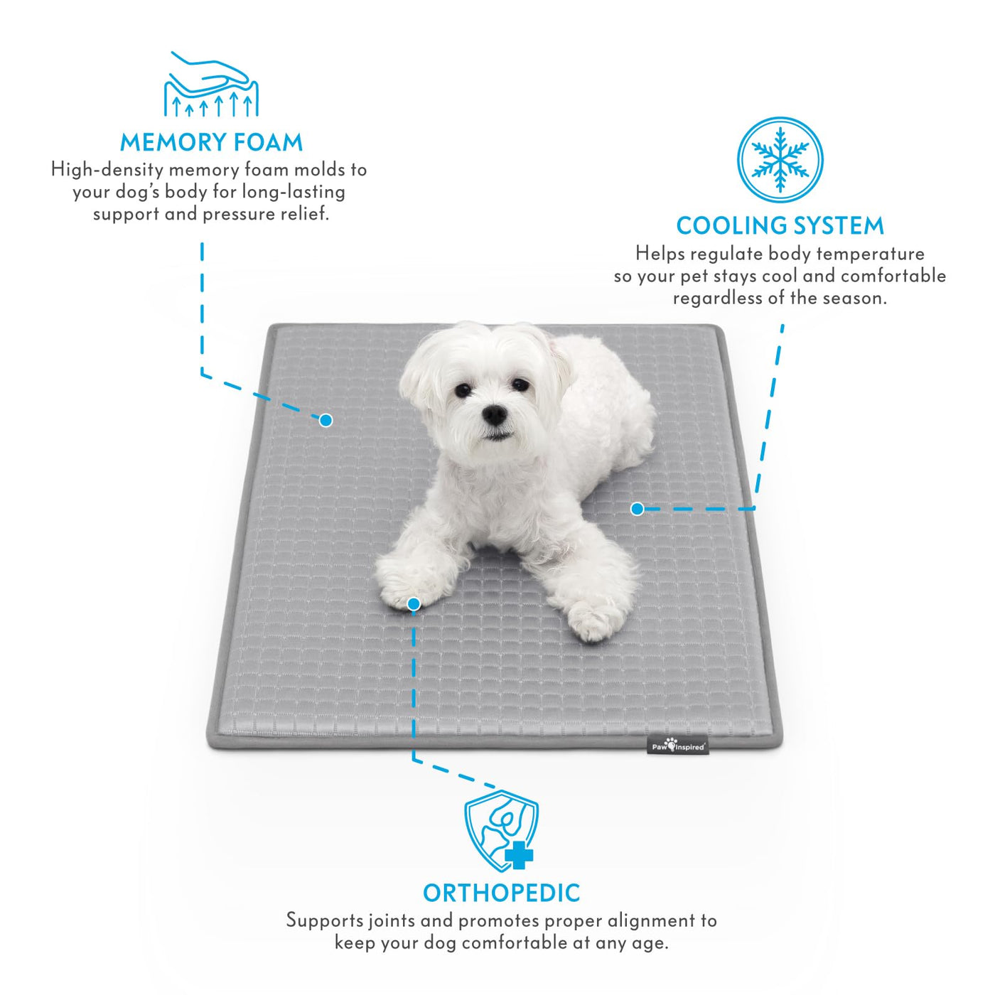 Give your dog the best of comfort and cooling with this orthopedic memory foam dog pad, designed to offer joint relief and even, pressure-relieving body support, inside and outside of the kennel. The high-density memory foam interior helps reduce pressure on joints, while the top cooling layer keeps your dog comfortable even in warmer conditions -- great for post-surgery recovery, traveling, or daily use at home. Whether your pup needs extra cushioning due to age, injury, or simply deserves premium rest, this cooling crate mat combines pressure-relieving memory foam with a cooling surface that keeps your dog comfortable all year round, regardless of the season. This versatile mat is great for any breed, large or small. Sized to fit most standard crates and kennels, it is the perfect soft mat to cover a plastic or metal crate tray or even the flooring of a wooden furniture-style crate. Or if youre looking to provide the best comfort for your dog while out and about, this compact and travel-friendly mat is the perfect piece to bring along. No more lugging around a heavy dog bed just to provide your pup with extra support -- the Paw Inspired Cooling Orthopedic Crate Mat provides heavy-duty quality but is totally lightweight and portable.
