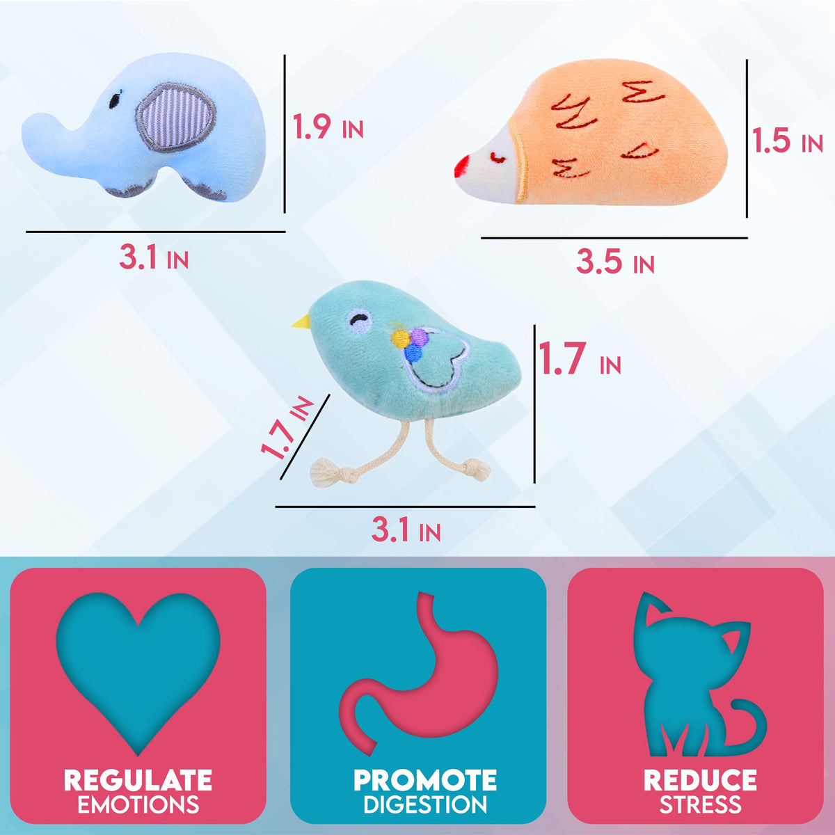 Q: What benefits do catnip toys provide for my cat?A: Catnip toys, like those included in this set, help stimulate your cat's physical activity, reduce stress, and encourage natural hunting instincts. They are great for promoting exercise and overall well-being.