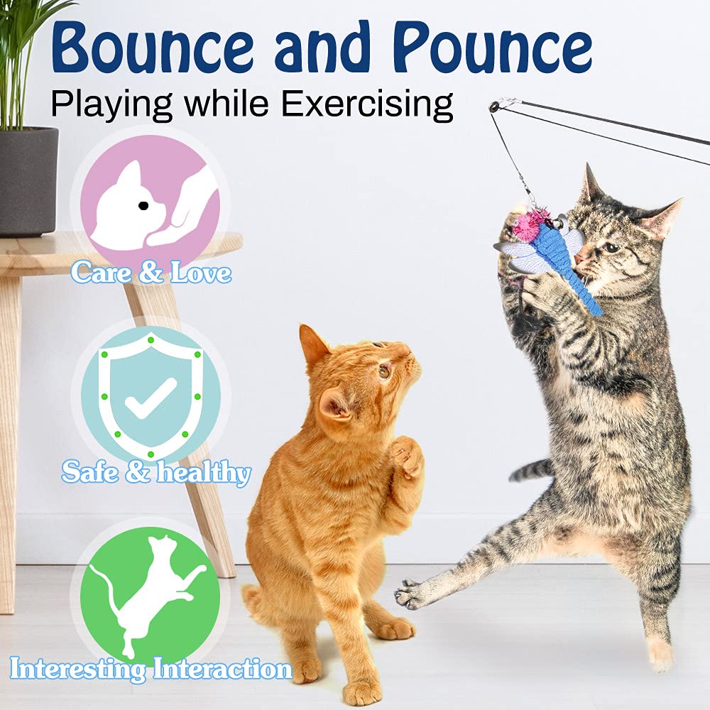 Pawaboo Cat Feather Toys, 4 Pack Interactive Cat Feather Teaser Wand Toys, Retractable Fishing Pole Wand Catcher Exerciser With Refill Fish, Dragonfly Worm With Bells, Fun Cat Kitten Kitty Playing Toy