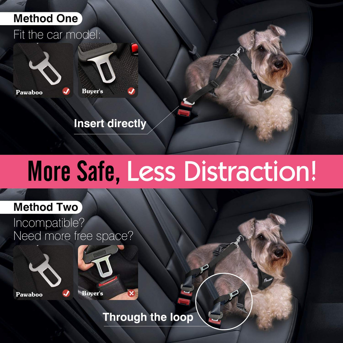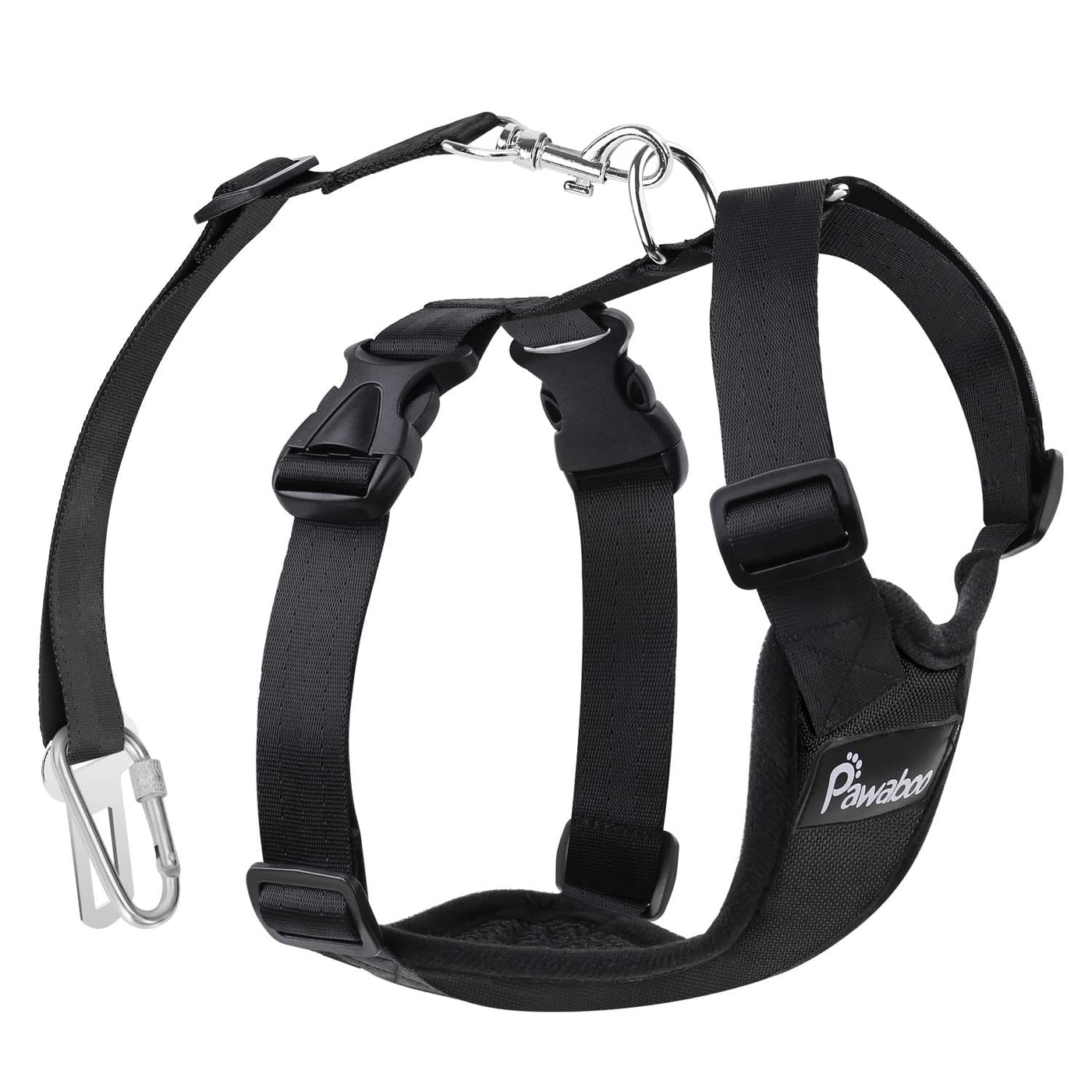 Q: How does the Pawaboo Dog Safety Vest Harness ensure driving safety?A: This harness is designed to restrain your dog securely in one position while traveling in a car. It prevents dogs from jumping out of windows or moving around, which reduces driver distraction and keeps your pet safe in case of sudden stops.