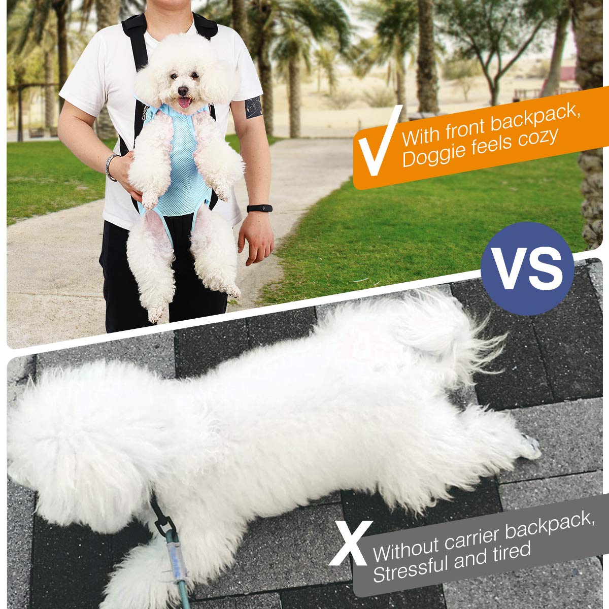 Pawaboo Front Pet Backpack: This high-quality front pet backpack helps you to take your beloved dog or cat together safely and comfortablely. Suitable for hiking, camping, shopping, going on bike rides or more activities outside, let your pet enjoy a soothing stroll while keeping your hands free. Product Description: * EASY TO OPERATE: Easy in and easy out, very convenient! With zipper and hook and loop on both sides of the backpack, convenient pet wear and take off. * BREATHABLE: Plenty of mesh area provide adequate ventilation and keep your pet cool. * COMFORTABLE: Sturdy fabric with sponge padding ensures durability and provides comfort for you and your pet. * ADJUSTABLE: Adjustable strap helps you to balance weight and makes it more comfortable wear. The neck elastic can adjust the size according to the dog's or cat's neck * CONSIDERATE DESIGN: Fabric covered elastic provides some flexibility and gentle support to the pet. Suitable openings for legs and tail. Specifications & Details: ✿ Material: Polyester Fibre ✿ Size Reference: ♣ Small: Chest Girth 4. 5', Outside Legs Distances 5', Outside Legs Distances 6', Outside Legs Distances 7', Outside Legs Distances < 12' NOTE: ✿ Please measure your pet before your purchase. ✿ Please allow slight deviation for the measurement data due to manual measurement.
