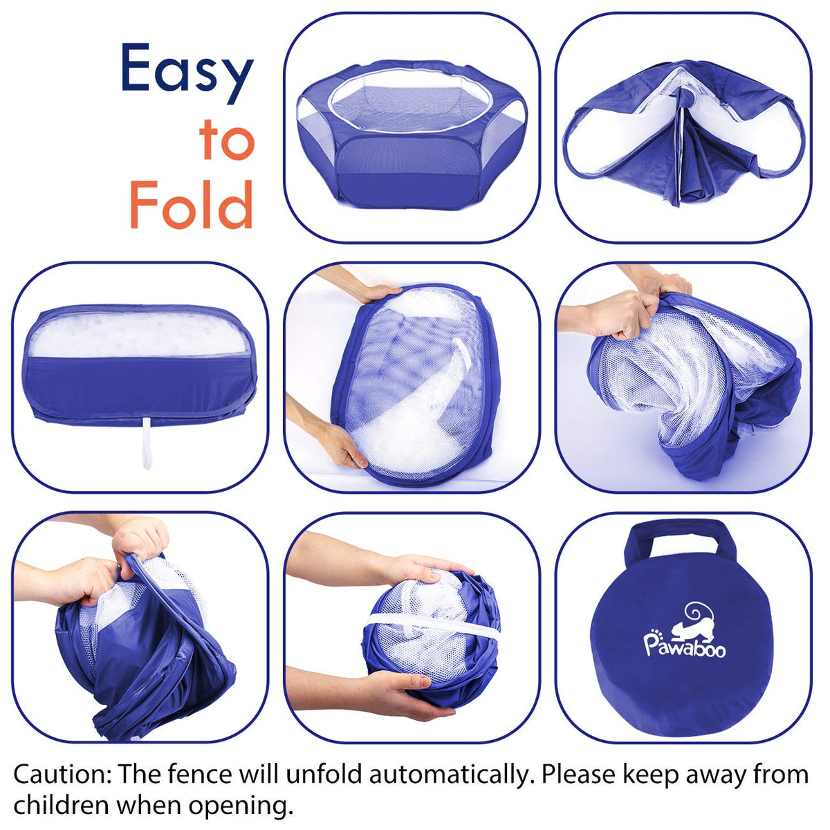 & :The quality of Pawaboo Playpens has been fully upgraded based on user feedbacks Higher density mesh ensures that your little one wont easily chew through and escape (Tips: you can use white vinegar spray to prevent damage in places that are easy to chew) NO MESS - WATERPROOF DESIgN :190T Waterproof Polyester Taffeta with the bottom of the playpen effectively prevent urine penetration into the floor (NOTE: For your small pet animals health please clean up the water stain in time) NO FUSS - POP OUT IN SEcONDS :No need for complex splicing because the fence will unfold automatically built in frame pops open in seconds (NOTE: Please keep away from children when opening due to the spring pressure) Folds back flat when not in use for easy carrying and storing SPAcIOUS & PORTABLE :Light and handy when folded(11 x 1127cm x 27cm) large and spacious when unfolded( 52 x 15133cm x 38cm) No trouble to carry a huge cage when you take your small pets out or no worry about getting lost Perfect for outdoor activities SMALL ANIMALS APPROVED :Suitable for small kittens hedeghogs hamsters chinchillas guinea-pigs gerbils ferrets squirrel bunny reptile or other small animals