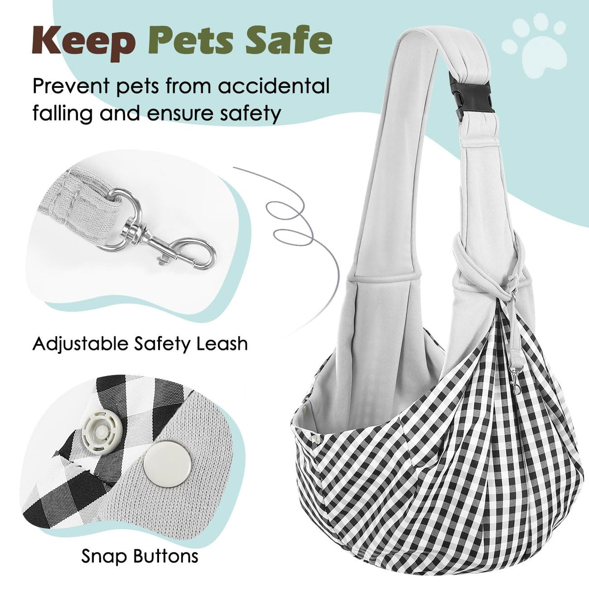 Pawaboo Adjustable Shoulder Strap Buckle Pet Sling Carrierproduct Features:Convenient Buttons Design: Specially Designed With Upgrade Buttons Opening, Convenient To Control The Opening Size Of Dog Sling Carrier. Give Pets More Sense Of Security.Storage Pocket Easy To Store: Adding A Pocket On The Shoulder, Which Is Very Convenient For You To Place Some Small Items, Such As Keys, Small Pet Toys, Pet Treats And So On.Built-In Safety Leash, Prevent Pets From Escaping: Durable Leash And Sturdy Metal Hook, It Can Securely Fix The Active Pets When Go Outing, Effectively Prevent Them Breaking Free.Specification:Item Size: 33.5 X 23.6 X 17.7In/85 X 60 X 45Cmrecommended Weight:Up To 12Lbs