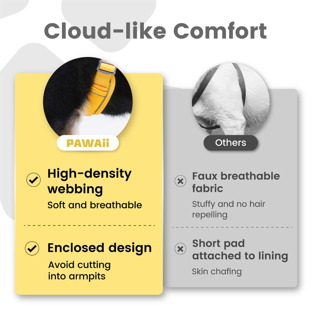 Q: What materials are used in the Pawaii Dog Harness?A: The harness is constructed from sturdy plastic buckles, breathable air mesh, soft padded cotton cushion, and a durable metal ring, ensuring comfort and longevity.