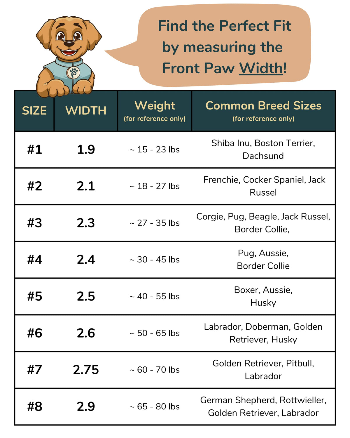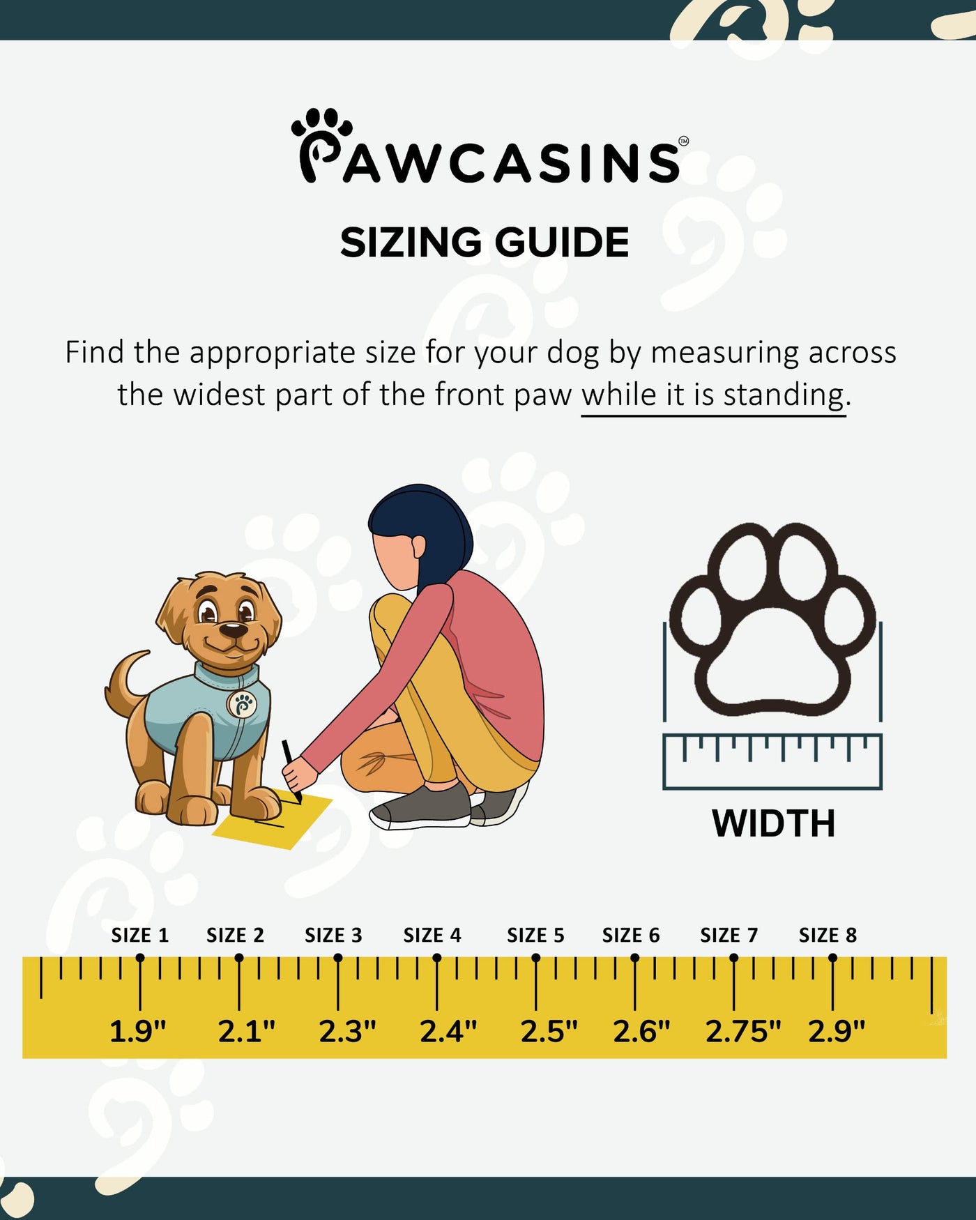 6. Use this measurement and refer to the Sizing Guide to select the appropriate shoe size If your dog is between sizes, choose the smaller size since back paws are generally a bit smaller than the front.