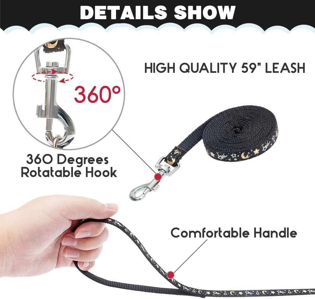 Cat Harness With Leash And Collar Set In The Package You Can Receive H-Shaped Harness * 1, Leash * 1, Cat Collar * 1. It'S An Excellent Combination To Take Your Cat For Outdoor Walking. Size: Harness: Neck Girth 7''-12'', Chest Girth 10''-18'', Leash Length 59'', Collar Measures 8''-12'' Soft Polyester Fabric Decorated With Miraculous Moon And Star, Luminous In Dark To Protect Kitties Day And Night. Double Plastic Clip And Buckle For Perfect Fitting And Easy-Wearing. D-Ring Attaches 59 In Leash With Revolving Hook And Comfortable Handle Let It Could Be Used For Any Occasion. Cute Bell To Make Your Cat Become The Popular Street Eye-Catching.