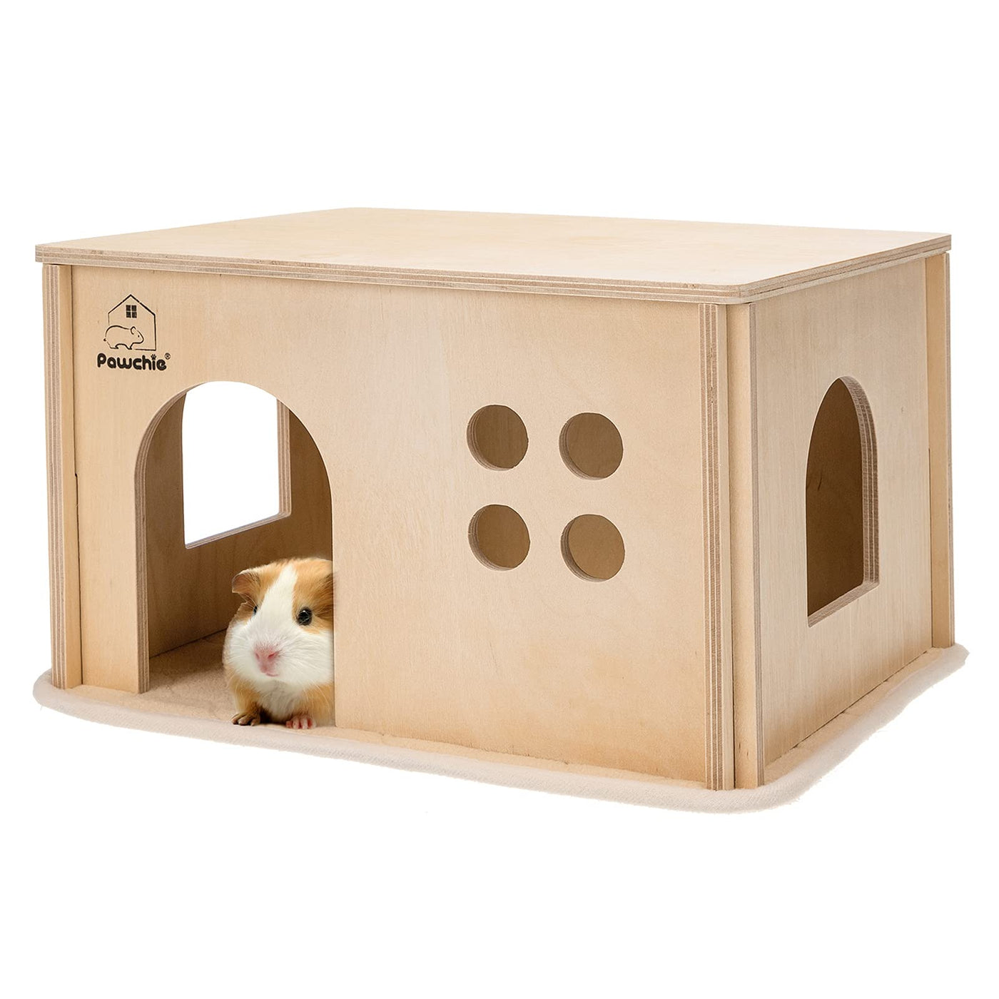 Pawchie Guinea Pig House Hide - Wooden Hideout For Chinchilla Small Animals, Habitat With Windows Guinea Pig Hamster Rat Living