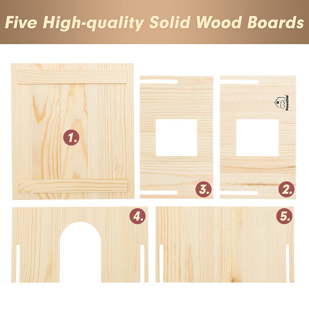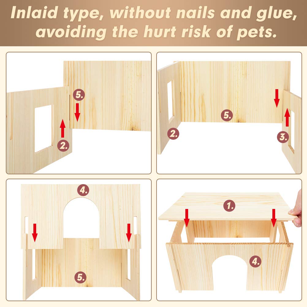 PAWCHIE Detachable and Large Size Wooden Hut with Windows, a ideal hideout for guinea pigs, hamsters, chinchillas & other small animals. The wooden house is made of high quality solid wood which is strong and durable, at the same time the wood is natural that the pets will have a very reassuring feeling in the hut, contribute to their healthy growth. Based on pet safety considerations, the house is designed to be inlaid, without nails and glue, in addition it iseasy to install. You can buy with confidence.